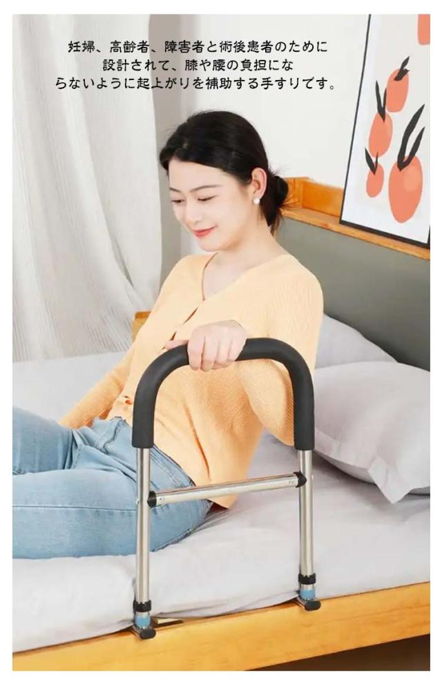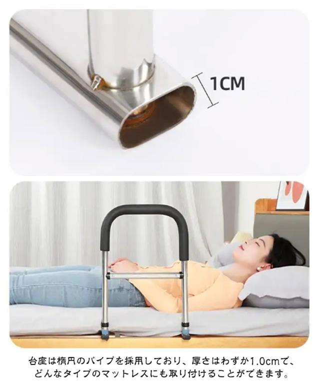 | ベッドに固定するだけ!折りたたみ可能ベッド用手すり。【組立不要】【耐荷重は150KG】 妊婦、高齢者、障害者と術後患者のために設計されて、膝や腰の負担にならないように起上がりを補助する手すりです。 ベッドからの転落防止や布団のズレ落ち防止にも役立ちます。 小物が収納できるポケットが付きます。 台座は楕円のパイプを採用しており、厚さはわずか1.0cmで、どんなタイプのマットレスにも取り付けることができます。 手すりの部分は滑り止めEVA素材で、滑り止め効果がありながら、冬でも冷たさを感じにくく。 【使用方法】:ただマットレスの下に挟んむだけでは不安な方に、ベッドの床板にはネジ止めで固定できます。 | |