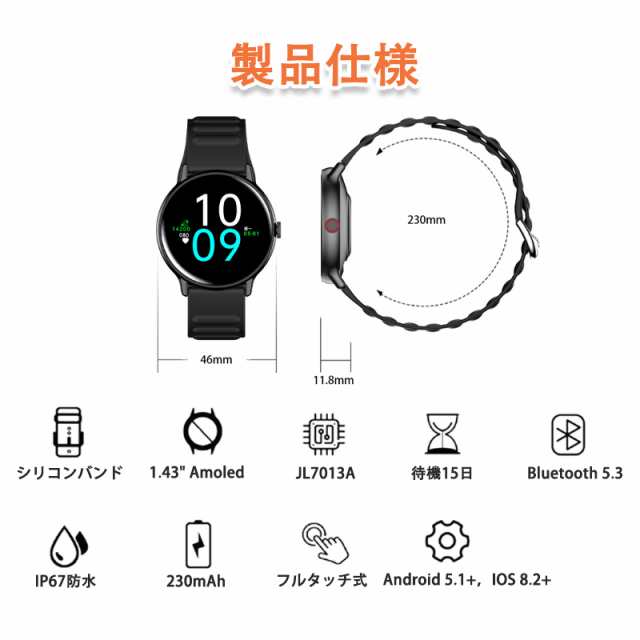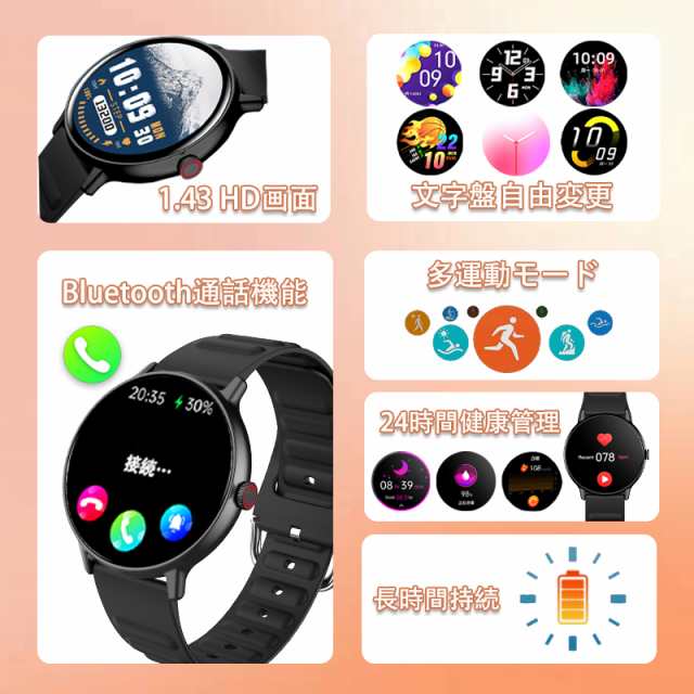 スマートウォッチ 通話機能 血糖値測定 1.43in 血圧 体温 血中酸素 心拍計 睡眠検測 iphone android対応 日本製センサー プレゼント