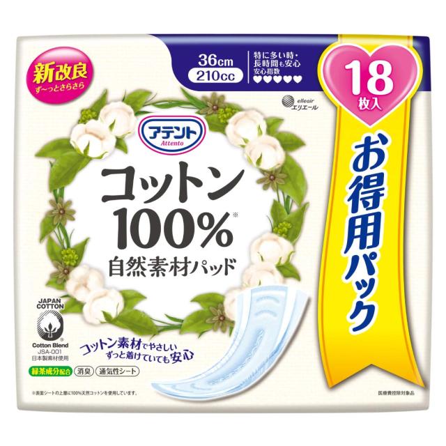 アテント コットン 100%自然素材パッド 特に多い時・長時間も安心【大容量18枚】