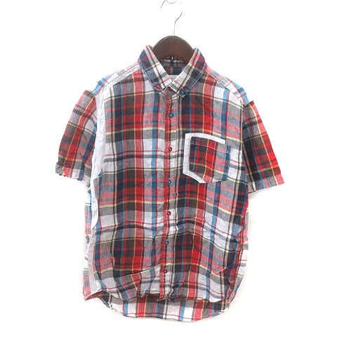 【中古】ヒロミチバイヒロミチナカノ ボタンダウンシャツ 麻 リネン チェック 半袖 M 赤 レッド 紺 黄 白 メンズ