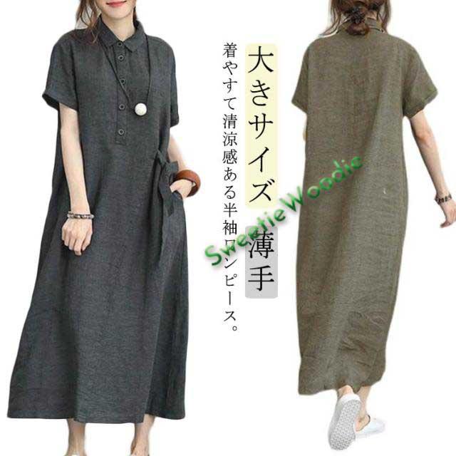 レディース ワンピース シャツワンピース 半袖 ロングワンピース シャツワンピ 綿麻 ゆったり ハーフボタン シャツワンピース 大きサイズ 春夏 母の日 30代 40代