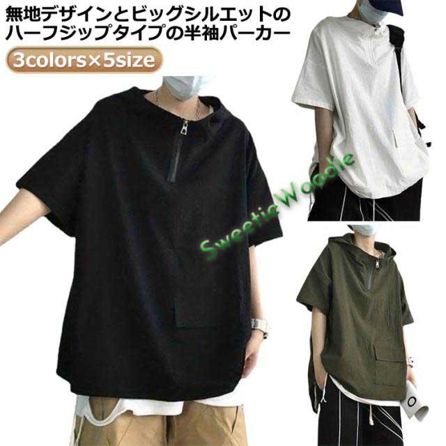 | 3colors×5size 無地デザインとビッグシルエットのハーフジップタイプの半袖パーカー どんなカジュアルな装いにもマッチ フード付きでカジュアルになりすぎず | |