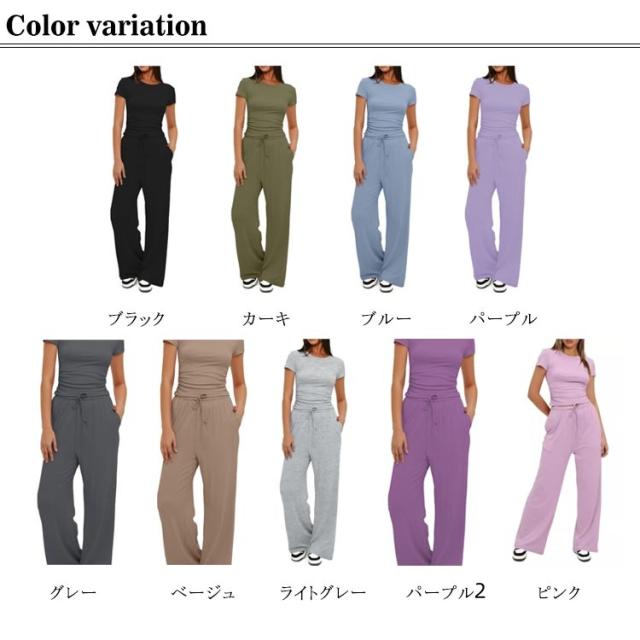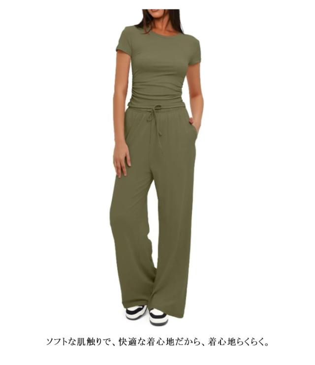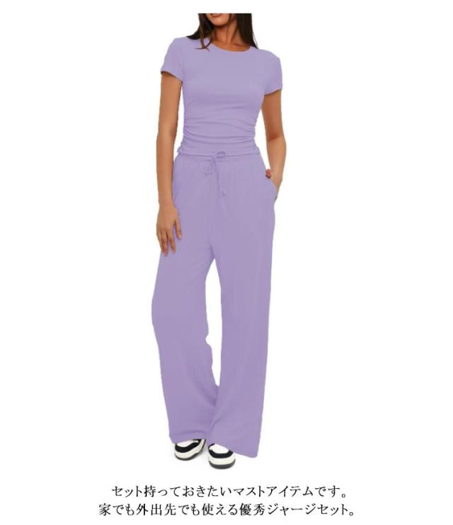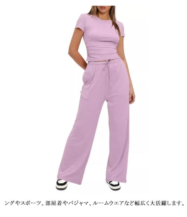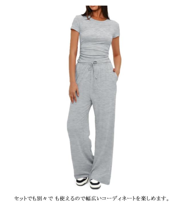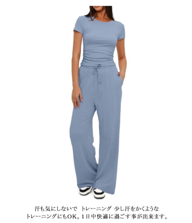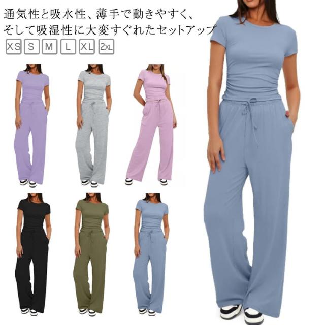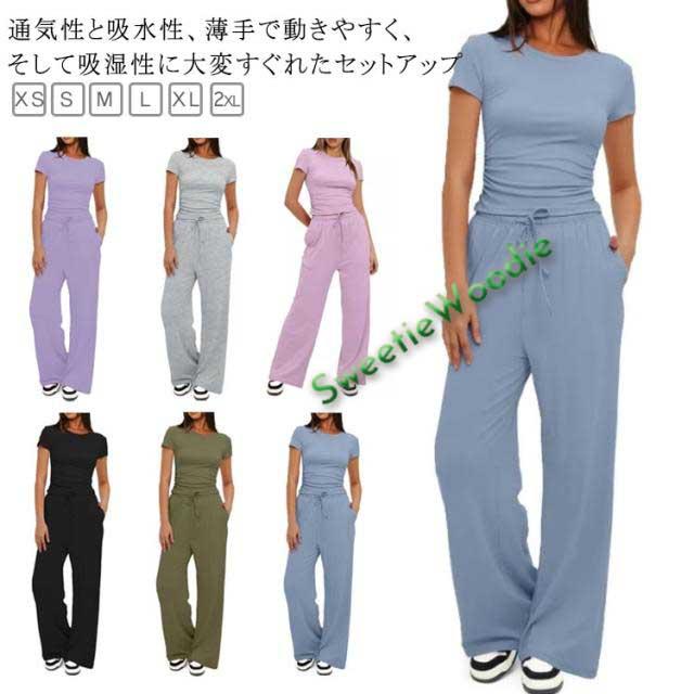 セットアップ レディース tシャツ 半袖 ジャージ ゆったり ワイドパンツ スウェット きれいめ クルーネック 体型カバー おしゃれ 上下セット パンツスーツ ルームウェア 部屋着 Tシャ ロングパンツ カジュアル 夏 ジョギング ヨガ 運動着 ダンス アウトドア 送料無料