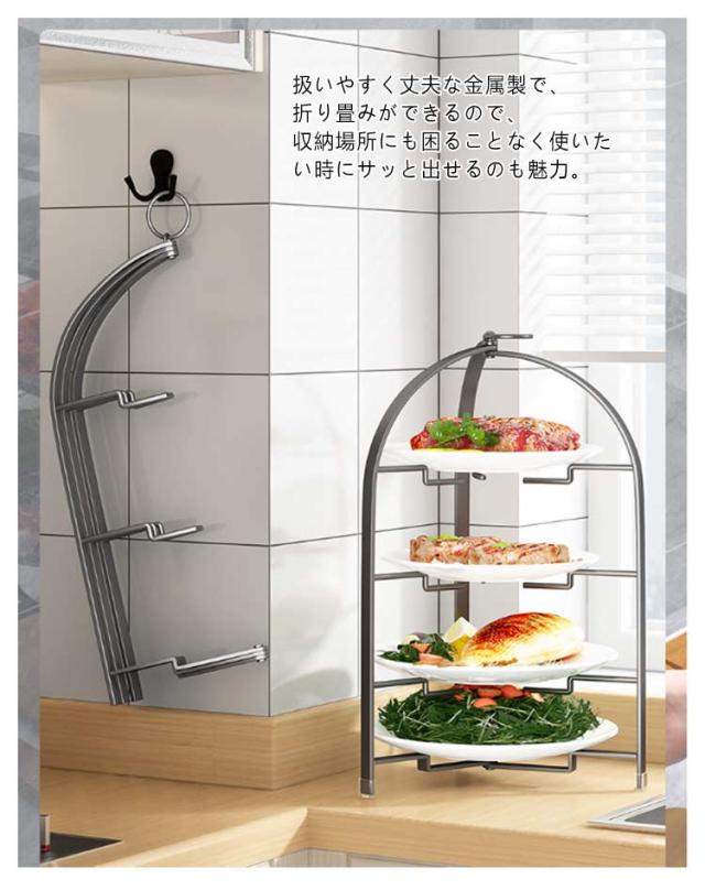 | 収納場所に困らない便利な折りたたみ式プレートスタンド 3段/4段 しっかりとした作りの折りたたみ式3段/4段プレートスタンドです。 扱いやすく丈夫な金属製で、折り畳みができるので、収納場所にも困ることなく使いたい時にサッと出せるのも魅力。 メンズライクなインテリアにも馴染みやすく普段使いができます。 折り畳みができるので、収納場所にも困ることなく使いたい時にサッと出せるのも魅力。 ティーパーティーの際のプチケーキや焼き菓子を並べて楽しむのはもちろん、ブルスケッタなどのフィンガーフードを並べるのもいいですね。 プレートがついていませんので、プレートによって雰囲気を変えて楽しめる良さがあります。 テーブルの上もスッキリと見せることができ、テーブル上のスペースも有効に活用することができます。 プレートの裏面を傷つけにくくするよう接地部には滑り止めシリコンがついている安心設計。 | |