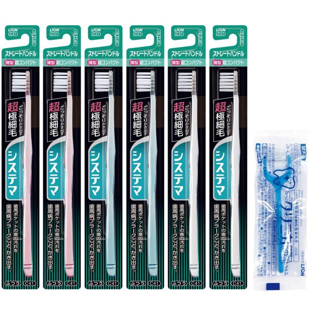【Amazon.co.jp限定】 システマハブラシ ふつう 超コンパクト ストレートハンドル 6本セット+ フロス付き 薄型ヘッド 超極細毛 歯ブラシ