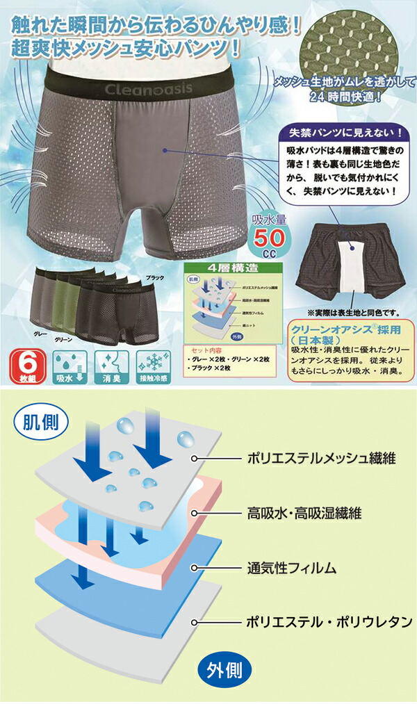 横漏れ防止吸水パッド付超爽快メッシュ安心パンツ6枚組 ムレ防止 抗菌防臭 メンズインナー