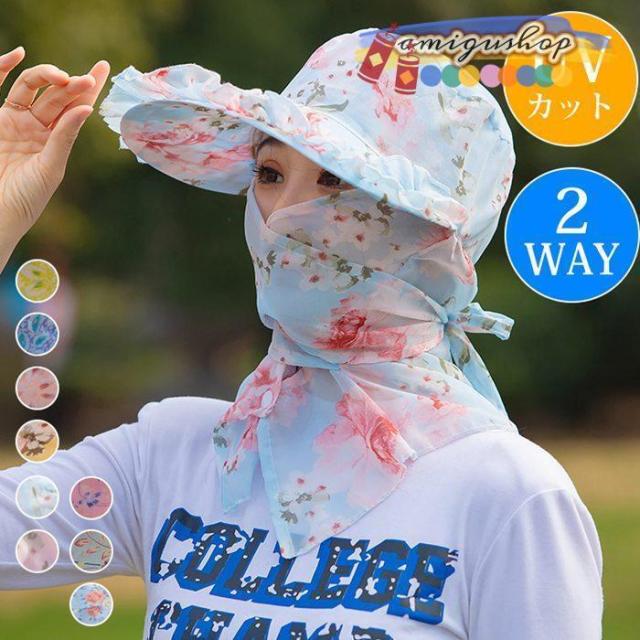 キャップ サンバイザー つば広 レディース UVカット UPF50+ 花柄 ボタニカル 2way ネックガード フェイスガード 日焼け防止 紫外線対策 春 夏 秋 遮光 日よけ 帽子 農作業 ガーデニング フェイスカバー プリント スポーツ 運動 ゴルフ 母の日 プレゼント