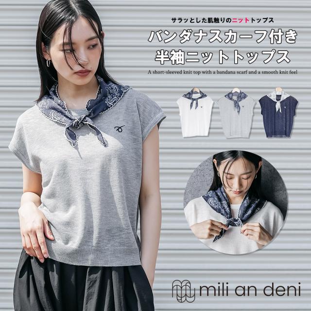 春新作 バンダナスカーフ付き半袖ニットトップス サマーニット ペイズリー柄 シアートップス M トップス 春夏 レディース ミリアンデニ メール便(郵2) t61038