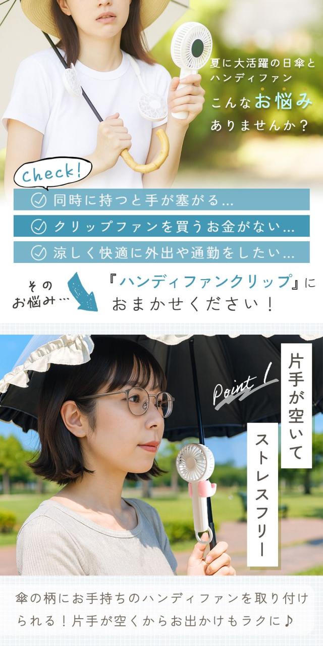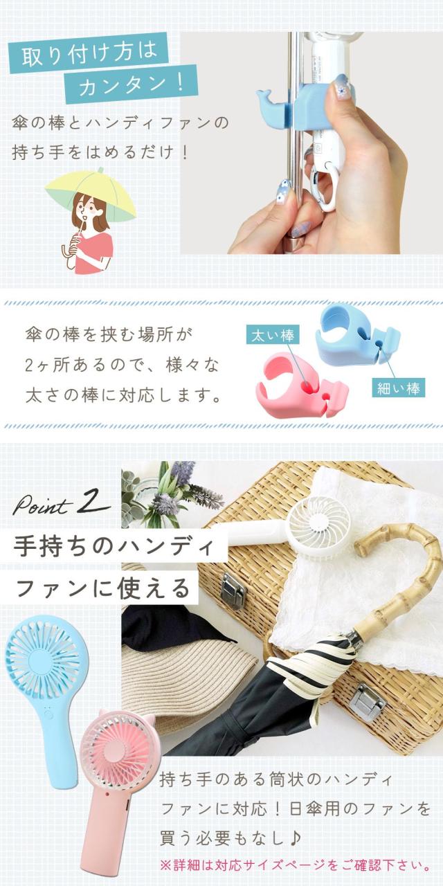 ハンディファンホルダーとして傘の骨に簡単に取り付けるだけで、真夏の外出時の暑さ対策や熱中症対策に大活躍。