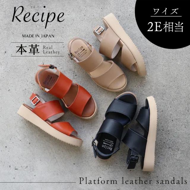 日本製 サンダル 厚底 レザー レディース シューズ くつ 靴 ローヒール ぺたんこ 柔らかい やわらかい 痛くない 外反母趾 2E ベーシック シンプル ストレスフリー 伸縮性 滑りにくい ゆったり カジュアル 大人 夏 涼しい recipe レシピ