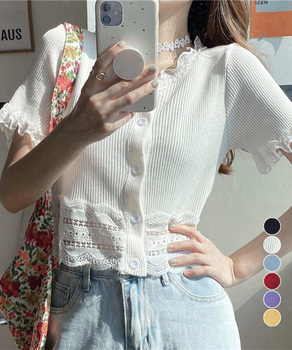 レースフリルニットトップスショート丈夏服