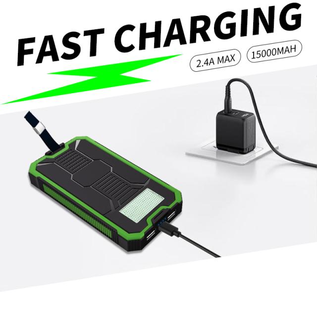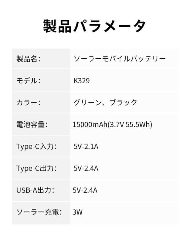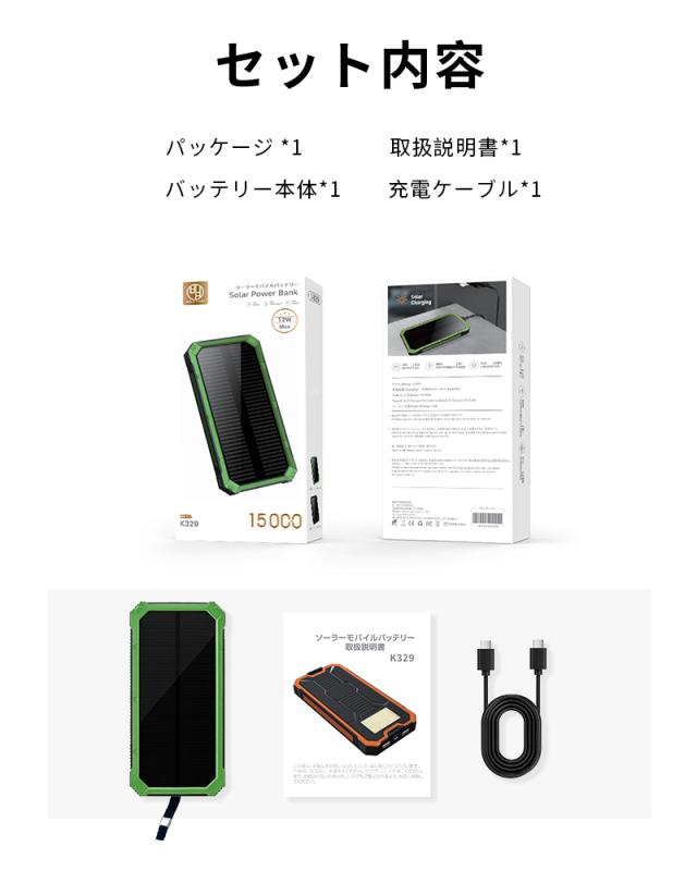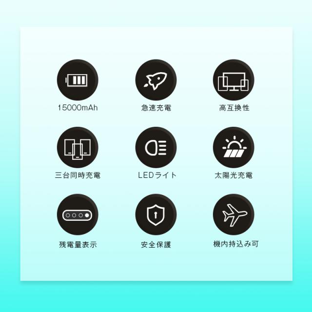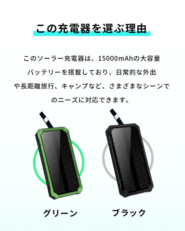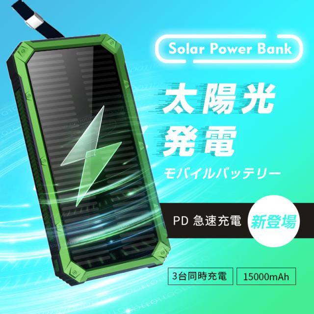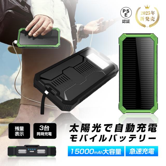 モバイルバッテリー 15000mAh大容量 2in1 ソーラーパネルを搭載 太陽光充電 LEDライト付き 3台同時充電 USB-A出力ポート Type-C出/入力 iPhone17/16充電 急速充電 小型軽量 スマホ/タブレット/イヤホン/スマートウォッチ充電 防災グッズ PSE認証【PL保険加入済み製品・安心】