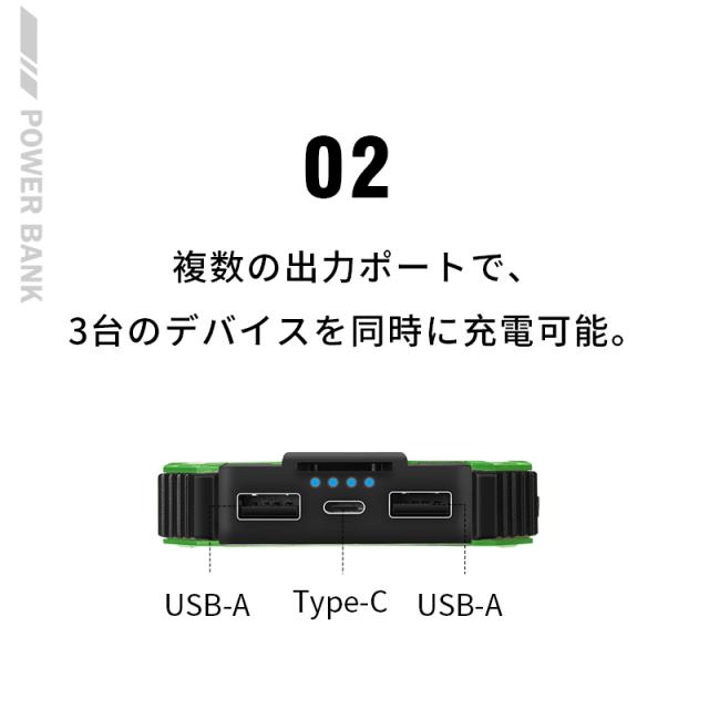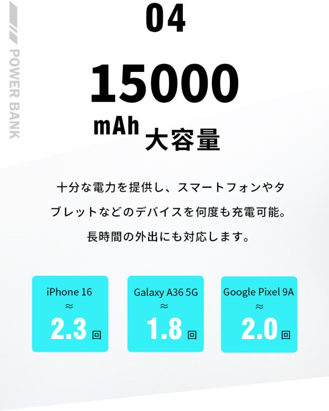 15000mAh大容量を備え、旅行、出張など電源の取りにくい環境で電池切れや容量不足の心配もありません。2つのUSB-A出力ポートと1つのType-C出力ポートがあるため、端末3台の同時充電を対応します。