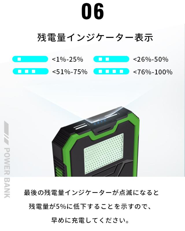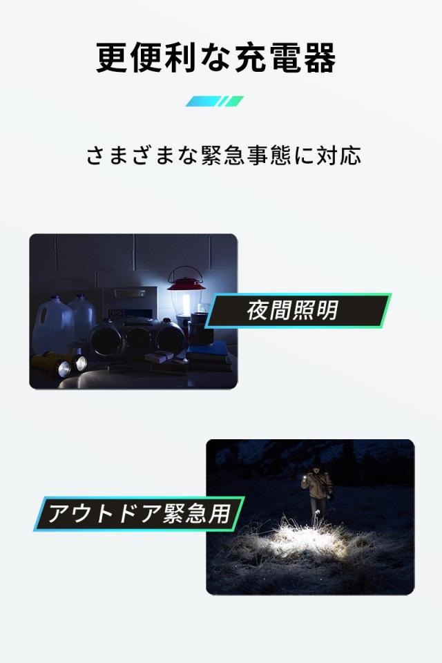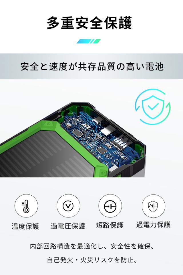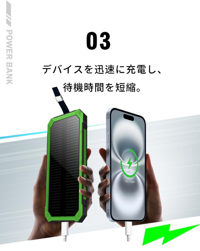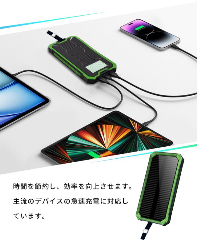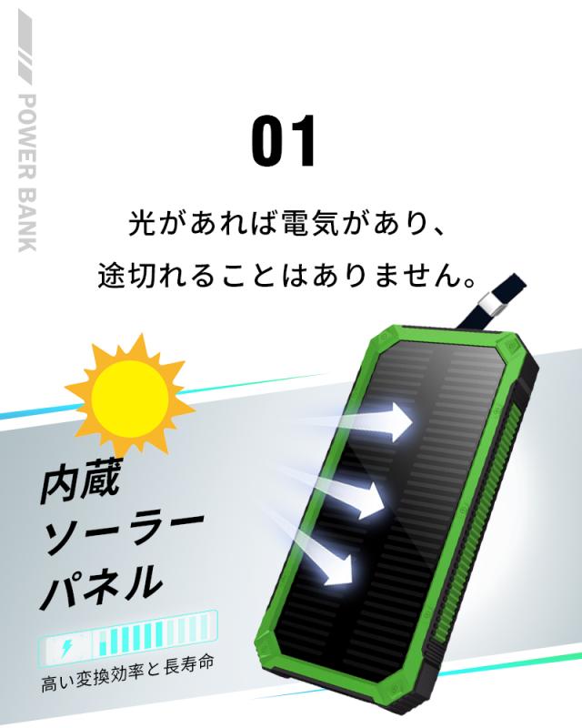 ソーラーパネルを搭載したモバイルバッテリーは、日当たりに置いて自動で充電できます。日頃のご使用だけでなく、旅行やキャンプなどのアウトドアシーンも、地震・災害時にも非常用電源とても大活躍です!