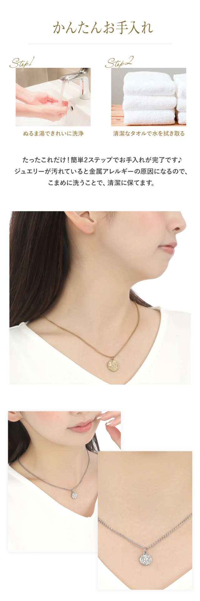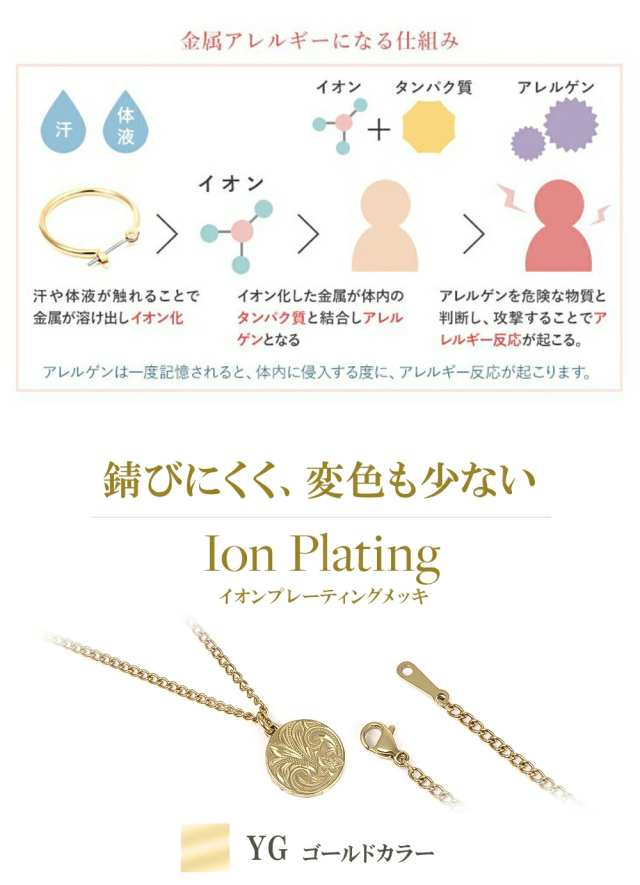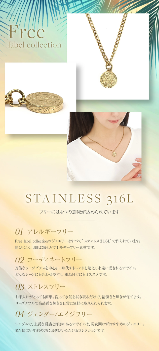 「ステンレス316L」は、”錆びにくく変色も少ない”という特徴があります。そのため、汗などに接触しても金属が溶け出しにくく、アレルギー反応を起こしにくいので、近年金属アレルギー対応のジュエリー素材として使用されています。アレルギーの方でも安心・安全にオシャレを楽しんでいただきたいからこそ、素材にこだわりました。