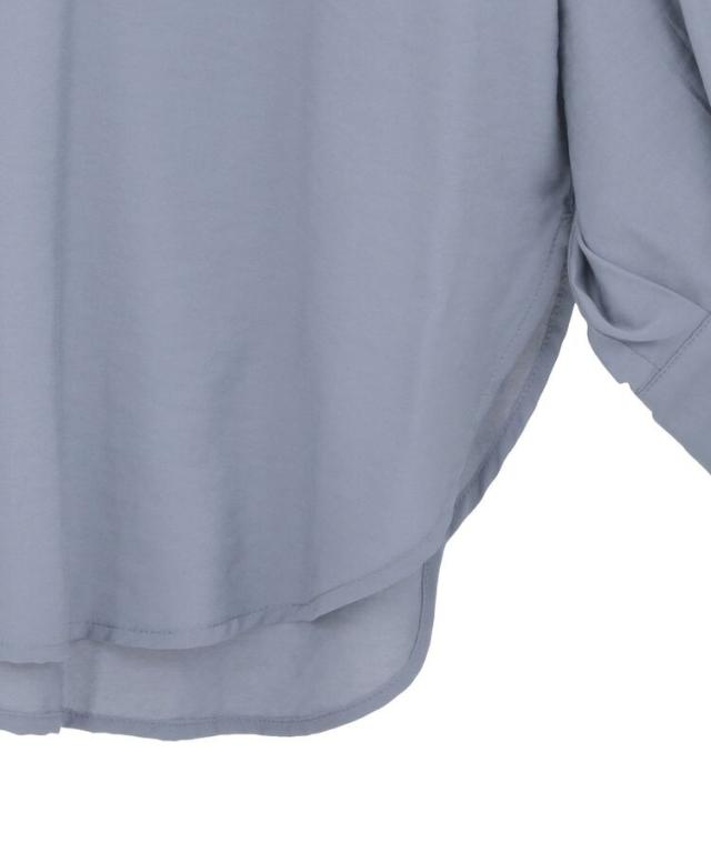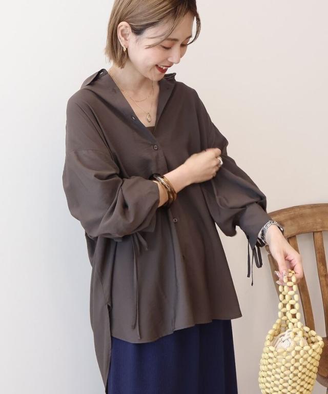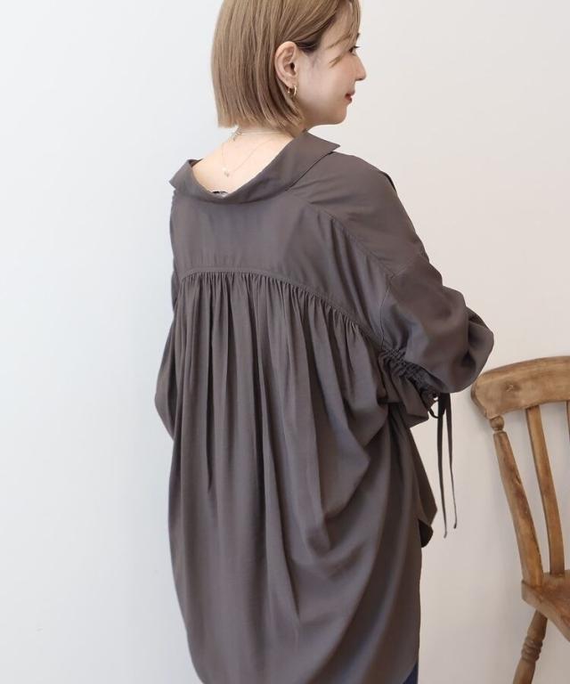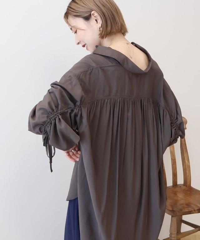 さらりと肌触りの良いレーヨンベースの生地で軽やかに仕立てたデザインシャツ。バックから袖にかけてギャザーを施しふんわりと柔らかく広がる立体フォルムが魅力です。袖のドロストを絞ればお好みでボリュームアレンジが出来るのもお洒落なポイント。一枚ではもちろん、暑さの残る季節の羽織りとしても活躍してくれるおすすめのアイテムです。透け感[ややあり]