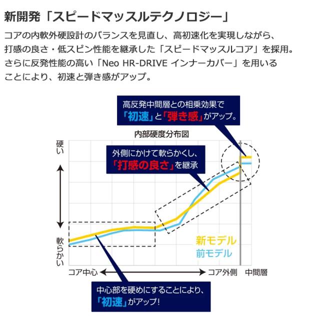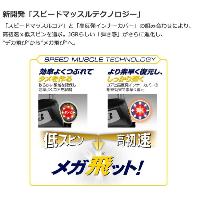 新開発のスピードマッスルテクノロジーが、ゴルフボールの効率的な「つぶれ」と素早い復元による「弾き」を進化させる。高初速が生み出すモンスター級の飛距離を体感せよ!