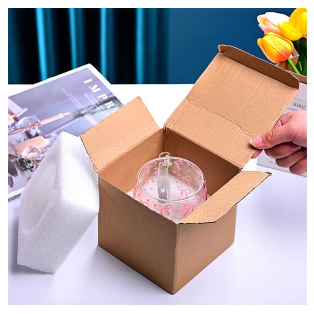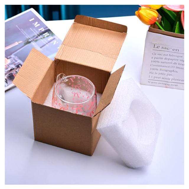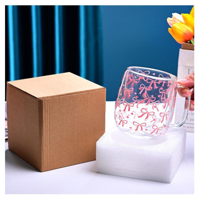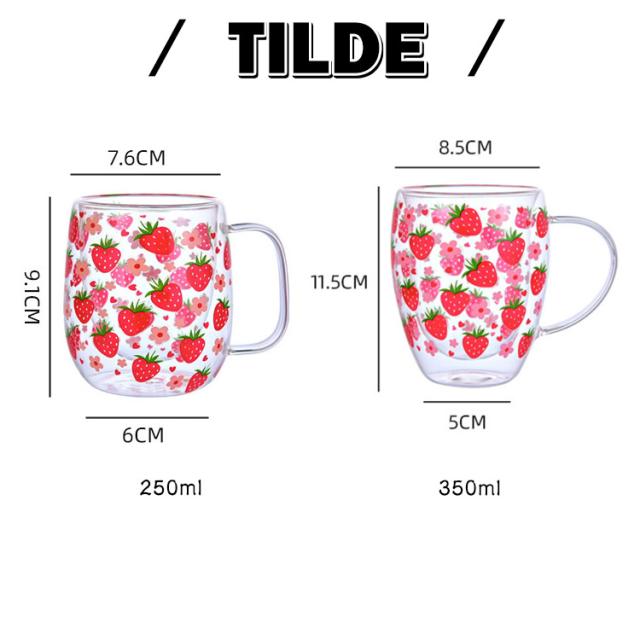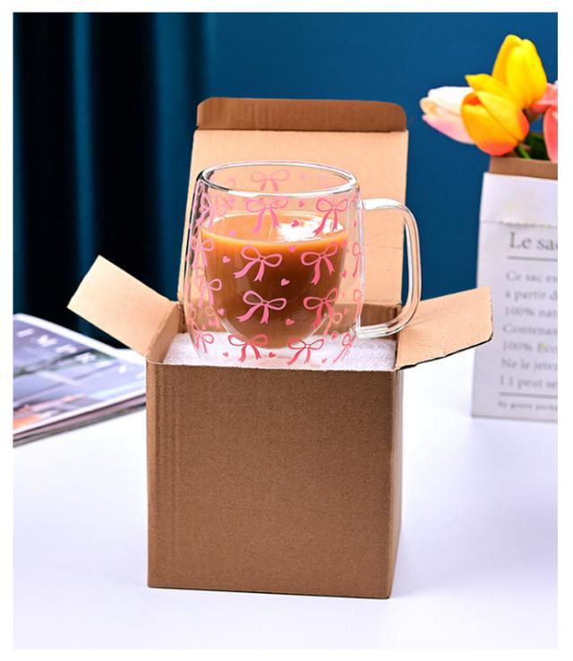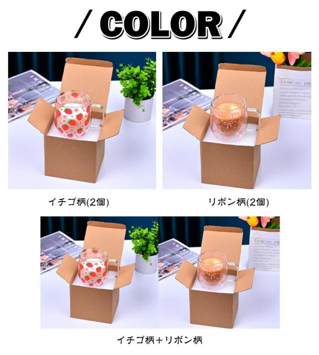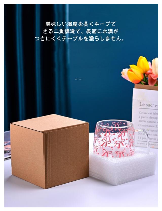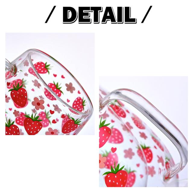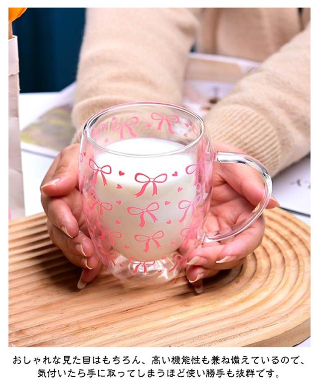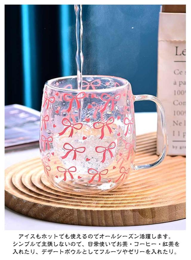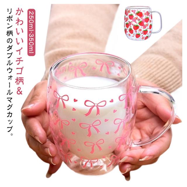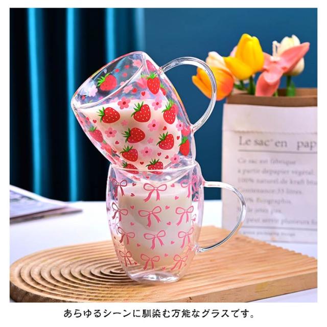 2個セット 取っ手付き 結露しにくい 2個セット 250ML グラス かわいい 350ML 耐熱ガラス リボン柄 マグカップ マグ カップ コップ イチゴ柄 二重構造 ティーカップ コーヒーカップ 透明 クリア ガラス 美しい 北欧
