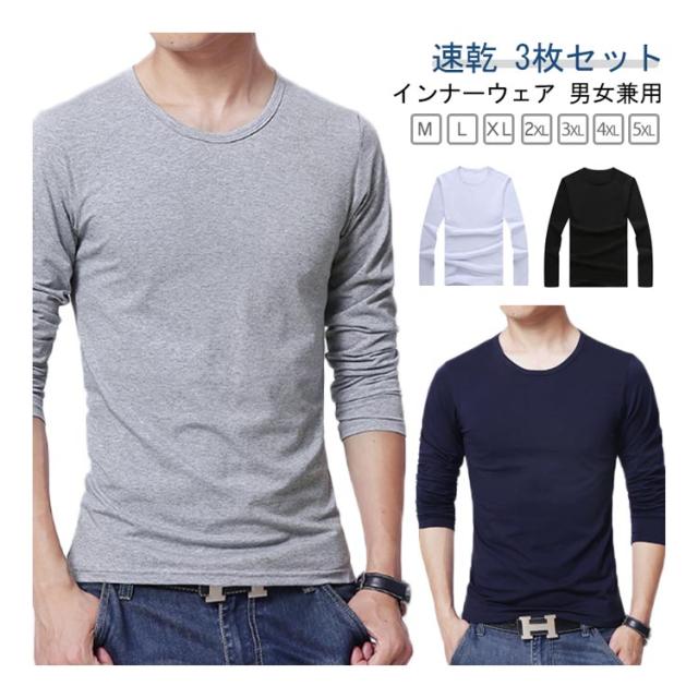 インナーシャツ メンズ 3枚組 接触冷感 Uネック Tシャツ レディース 下着 長袖 クルーネック 丸首 大きいサイズ 男性用 アンダーシャツ アイスシルク 肌着 紳士 コットン 白 黒 無地 定番 シンプル オフィス 仕事 作業服 作業着 トレーニングウェア ゴルフ 野球