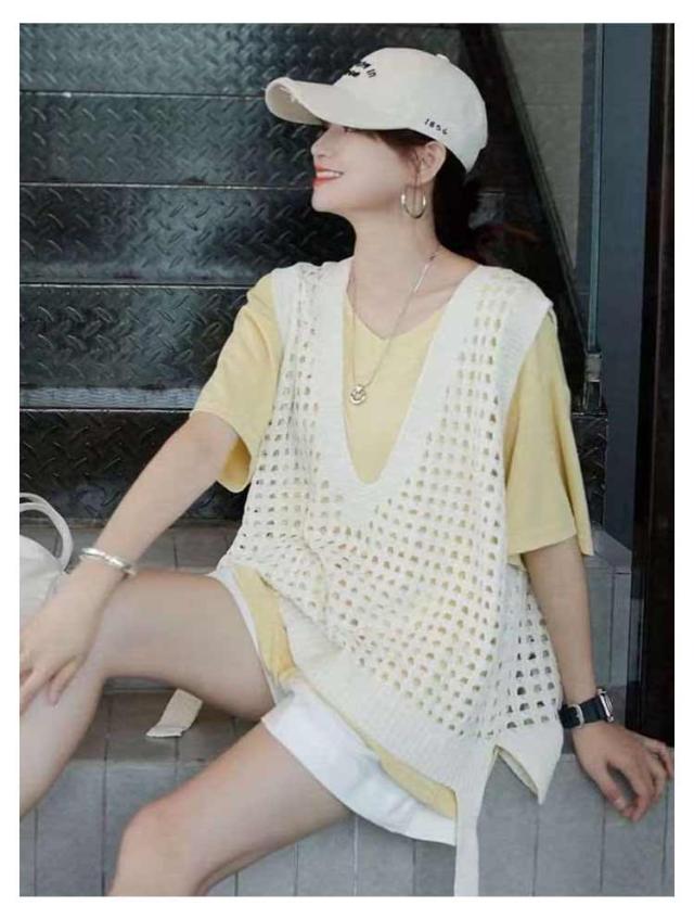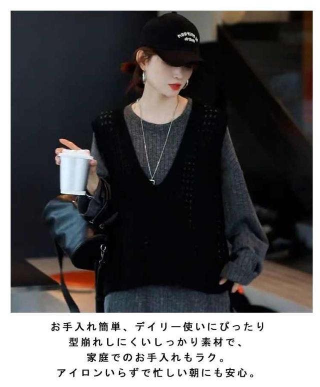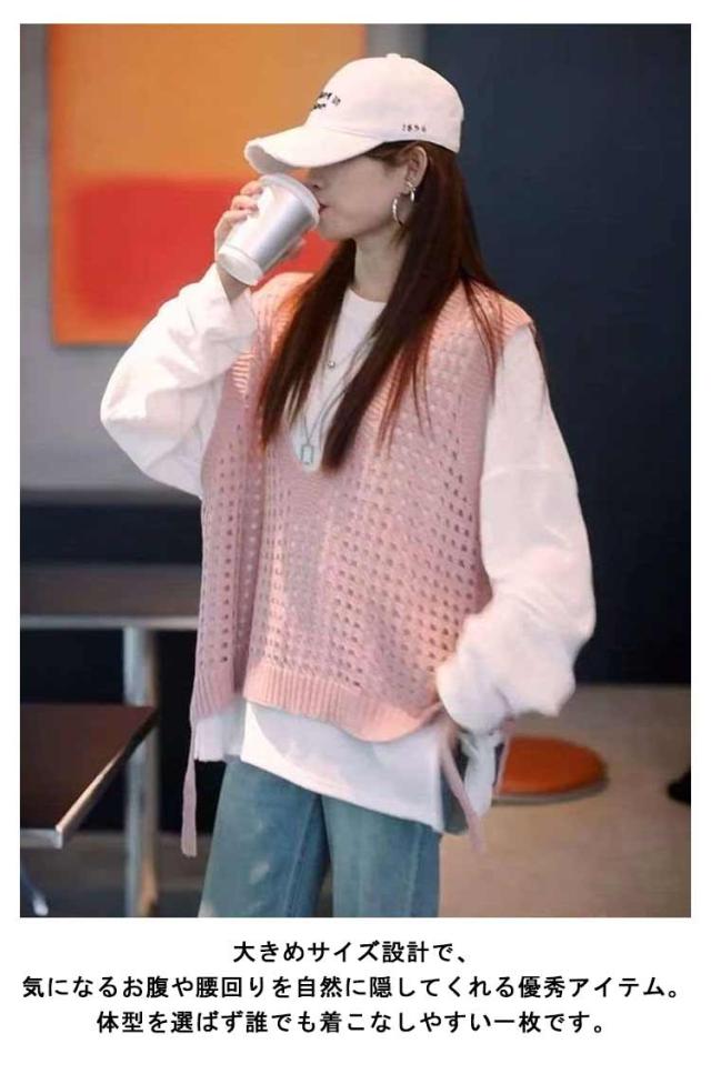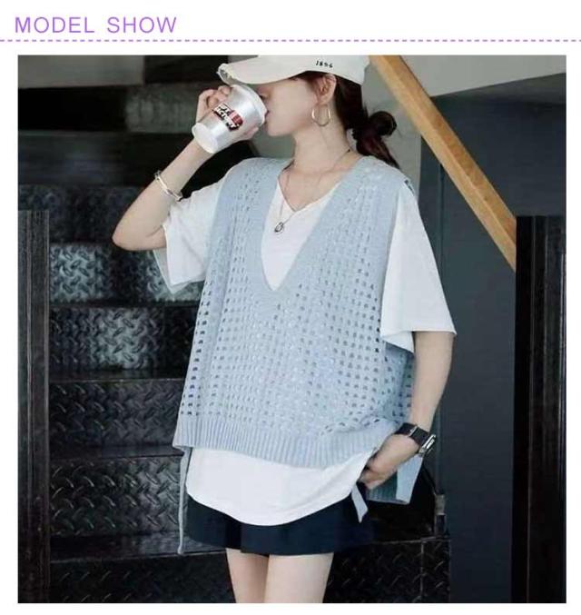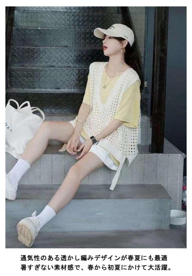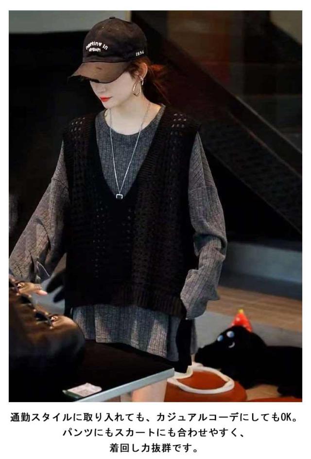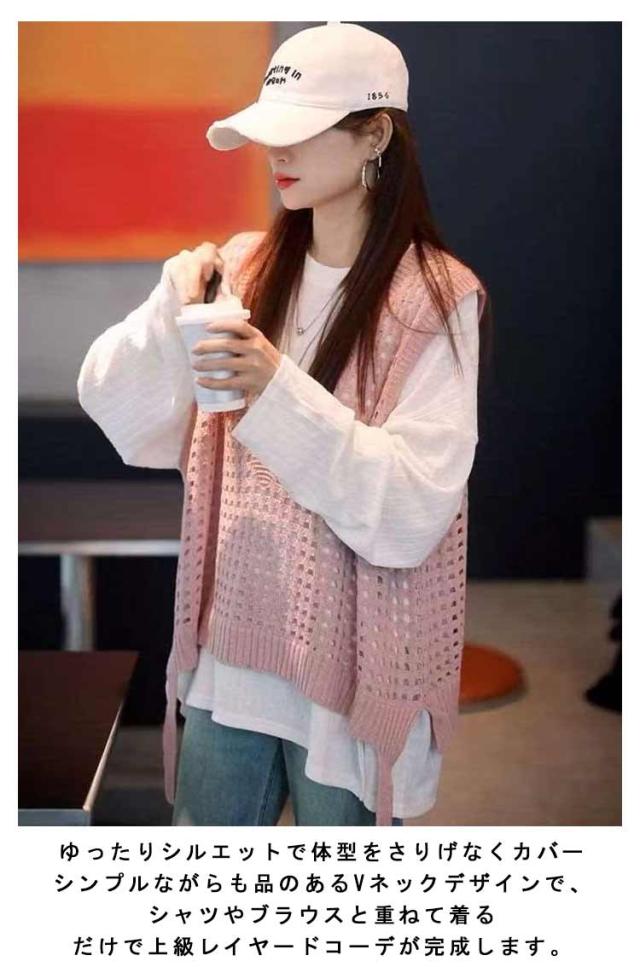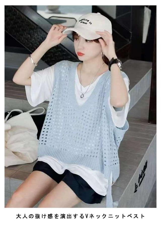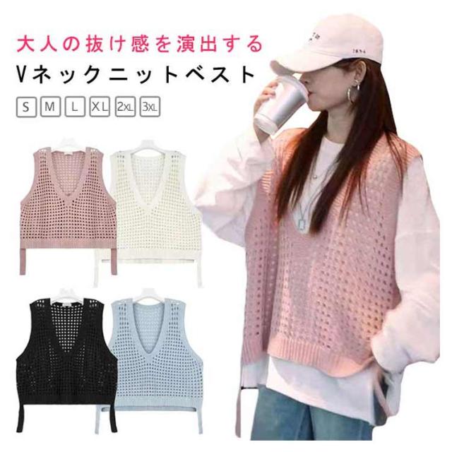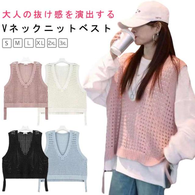 Vネック サマーニットベスト 大きいサイズ ニットベスト レディース ゆったり ゆるシルエット 透かし編み 重ね着 無地 春秋 シンプル 通気性 体型カバー ニットベスト カジュアル ナチュラル 通勤 ニットレイヤード
