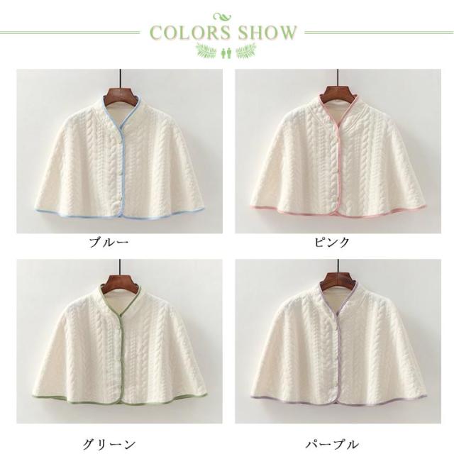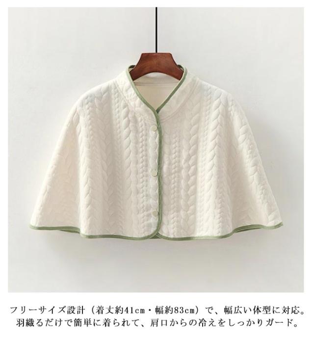 | 肩と首をやさしく包む、冷え対策に最適なケープ型ショール ふんわり軽くて一年中使える、快適リラックスアイテム 冷房の効いた部屋や就寝時、リラックスタイムにぴったりの一枚。 妊婦さんや産後の冷え対策にもおすすめ。肩まわりが冷えやすい方に嬉しい、柔らかく軽い素材で、ストレスなく着用できます。 フリーサイズ設計(着丈約41cm・幅約83cm)で、幅広い体型に対応。羽織るだけで簡単に着られて、肩口からの冷えをしっかりガード。 四季通して使える万能アイテム。春秋の軽い羽織りとしても、冬はインナーと重ねて、夏は冷房対策にと一年中活躍。 ふんわり柔らかい質感が肌に心地よく、寝るときもリラックス感たっぷり。ルームウェアやパジャマとの相性も抜群です。 | |