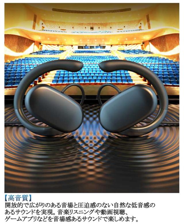 | 【耳を塞がない】負担なく使えるオープンイヤーイヤホン。従来のイヤホン特有の聞き疲れや耳の中の蒸れによる不快感がなく、長時間使用しても疲れにくい。空気伝導を採用したため、骨伝導イヤホンより違和感が少なく、骨伝導で聴きなれない方にはぜひこちらの空気伝導イヤホンがおすすめです。 【ながら聴きイヤホン】周りの音が聞こえる安心感。耳を塞がないため、周囲に気を配りながら音楽や番組を楽めます。外出時に車が迫る音、電車のアナウンス、いざとなる時の警報音、家事または仕事中の呼びかけ音などを聞き逃す心配はありません。また、耳を塞がないので自分の話し声がこもらず聞こえるため、毎回取り外す必要がなく、装着したまま自然な会話が可能。 【有線イヤホン】ペアリング不要、Bluetooth設定不要、充電不要。いつでも、どこでも、ケーブルを差すだけですぐに使える。電池切れ、音の遅延、接続不安定の心配は一切なし。オンライン会議に最適。Bluetooth機能のないデスクトップパソコンにも使えます。 【高音質】開放的で広がりのある音場と圧迫感のない自然な低音感のあるサウンドを実現。音楽リスニングや動画視聴、ゲームアプリなどを音場感あるサウンドで楽しめます。 【マイク付き】高品質なマイクが内蔵されており、有線接続による非圧縮の音声信号の特性と合わせることによりクリアな通話を実現します。 【耳掛け式】両耳合わせて28gの超軽量タイプで、長時間装着しても耳への負担が少なく、付けるのを感じられないほどの軽さです。また、耳の形にピッタリフィットする耳掛け式で、激しい運動中も落下の心配もありません。 | |