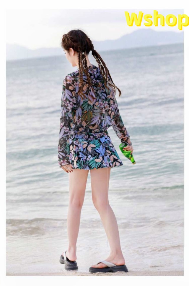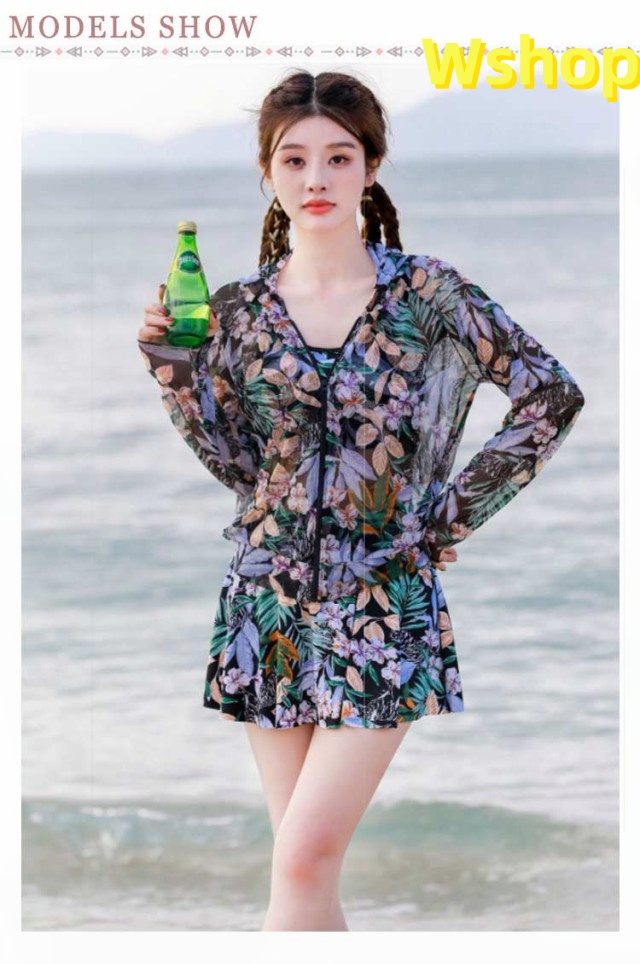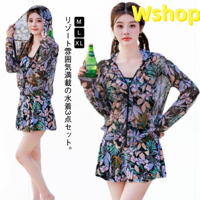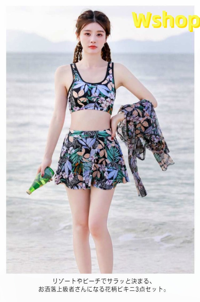 | リゾート雰囲気満載の水着3点セット。 透け感のあるシースルーラッシュガードが大人でセクシーなデザインとなり、露出を控えめに、日焼け対策にもなります。 可愛さはそのまま、しっかり体型カバーできる3点セット、ママやミセスに大人気! リゾートやビーチでサラッと決まる、お洒落上級者さんになる花柄ビキニ3点セット。 | |