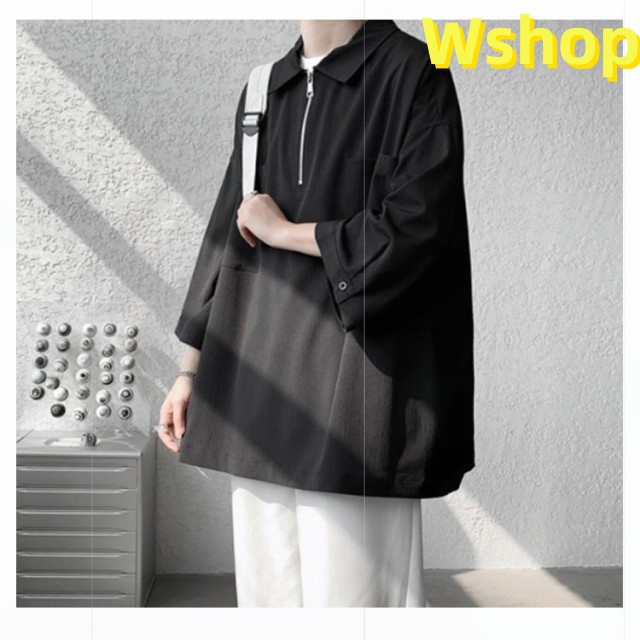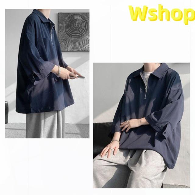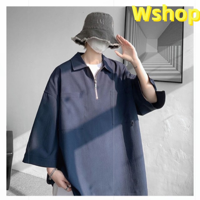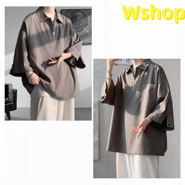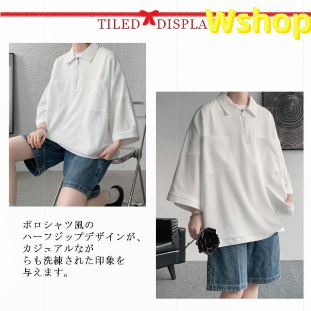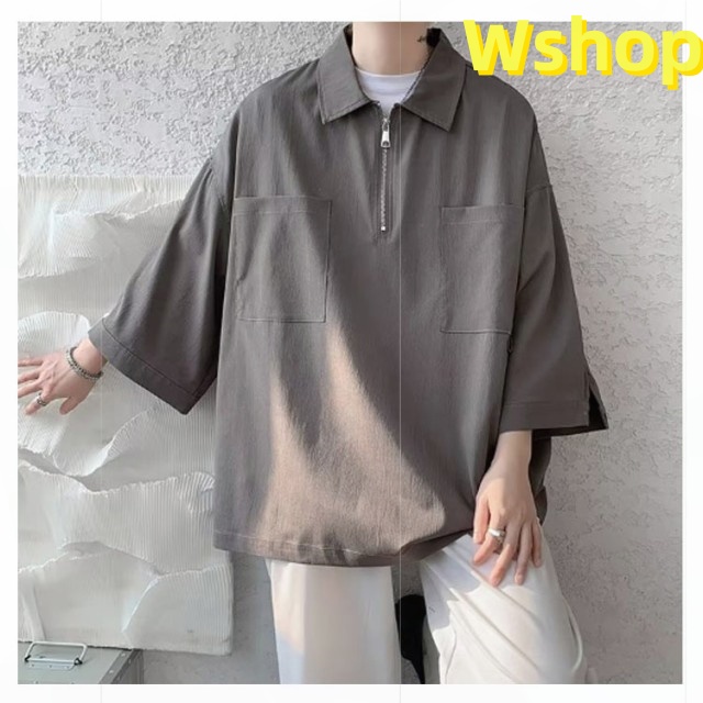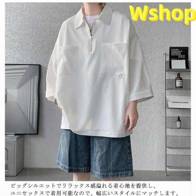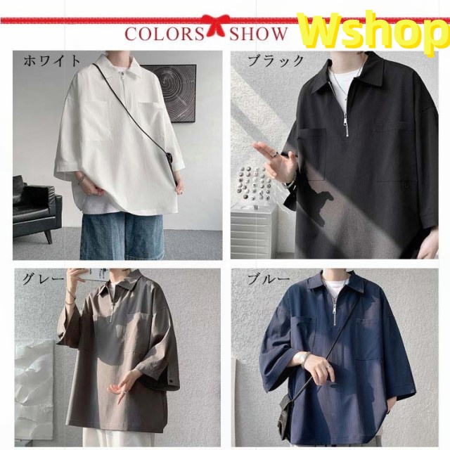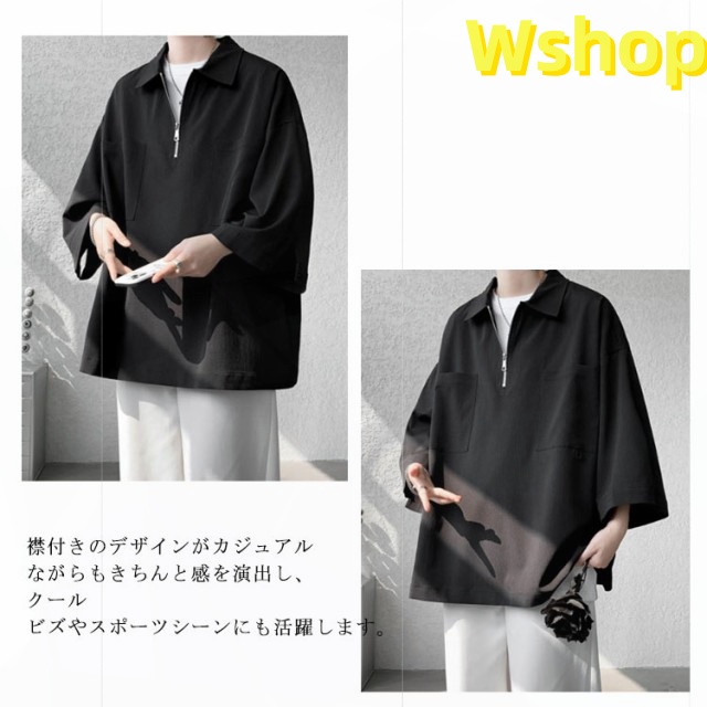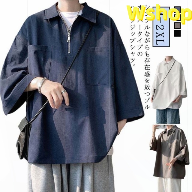 プルオーバーシャツ 襟付きTシャツ 七分袖 ゆったり 無地 ビッグシルエット 五分袖 20代 ジップシャツ ハーフジップ 30代 メンズ トップス 大きいサイズ 5分袖シャツ カジュアルシャツ 夏 ポロ風 ポロシャツ