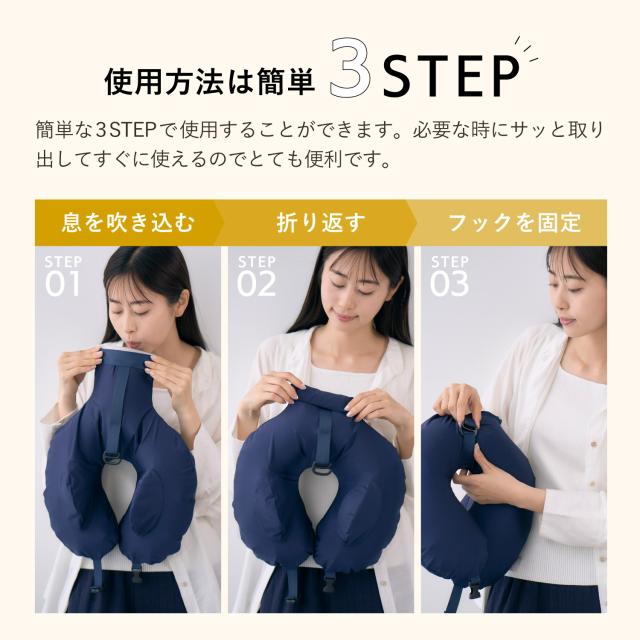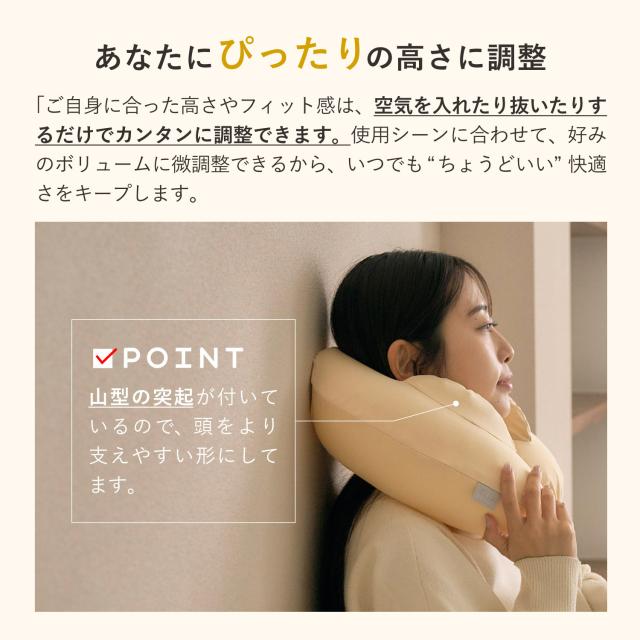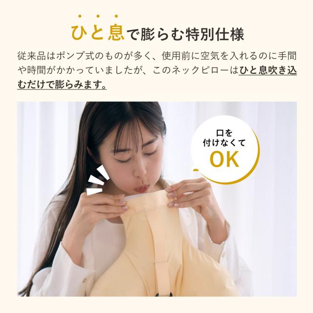 携帯性抜群!新発想のネックピローでいつでも快適な休息を。旅行や出張、オフィスでの仮眠にぴったり!驚くほどコンパクトに収納できる、このネックピローは、あなたの移動をより身軽にし、どこでも快適な休息をサポートします。リュックに入れても邪魔にならない超コンパクトサイズが非常に魅力的な点です。その秘密は、「ひと息でふくらむ」特別仕様(生産工場の特許取得済み)にあります。従来のポンプ式ネックピローが膨らむまでに時間を要したのに対し、この新構造なら必要な時にサッと準備が完了します。飛行機、新幹線、バスでの移動中も、待ち時間なく快適な睡眠環境を整えられます。この独自の仕様のおかげで、高さやボリュームの調整も自由自在。空気を入れたり抜いたりするだけで、あなたの首にぴったりの快適な状態を簡単に見つけられます。移動中の首の負担軽減、リラックス効果を追求したこのエアピローで、移動中や休憩時間、どこにいても心地よいリフレッシュを体験してください。