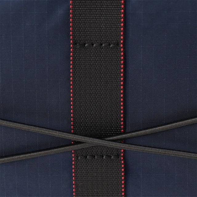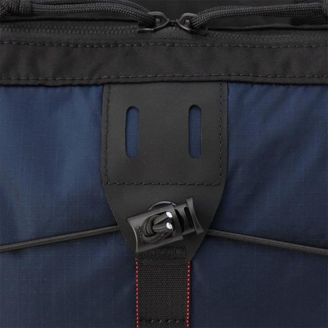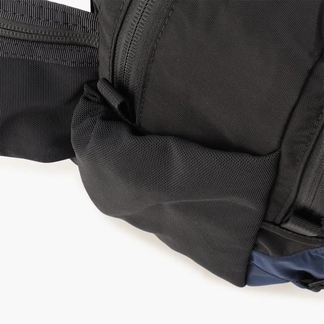 工場から回収された製造廃棄物を再生したリサイクルナイロンをメインに、フロント部分にはコーデュラ(R)と同等の強度を持つ軽量なナイロンを用いています。