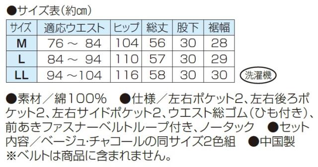 ●仕様/左右ポケット2、左右後ろポケット2、左右サイドポケット2、ウエスト総ゴム(ひも付き)、前あきファスナーベルトループ付き、ノータック