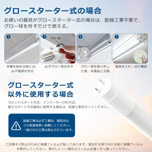 - ※両側給電対応 グロー式工事不要! グロースターター方式の器具は、グロー点灯管を取り外すだけで、そのままご使用できます。 ※ ラピッドスタート式&インバータ式の場合、工事は必要です。 *電気資格者による配線工事を行うようお願い致します。