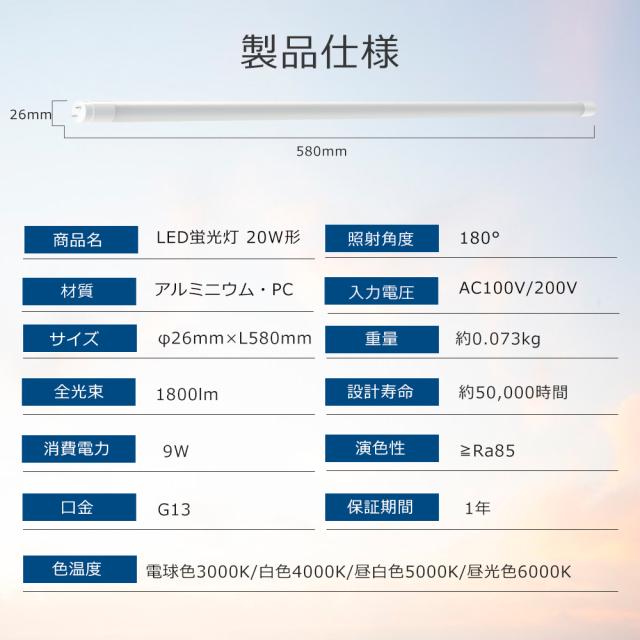 【100本セット】 G13口金 LED蛍光灯 20W形 直管 グロー式 工事不要 両側給電 電球色 白色 昼白色 昼光色 LED直管蛍光灯 FHF20 FLR20 FL20 LED蛍光管 58cm 消費電力9W 高輝度1800lm T8管径 LED蛍光灯器具 直管LEDランプ 蛍光灯 20W型 LED照明器具 防虫 防塵 PSE認証 1年保証