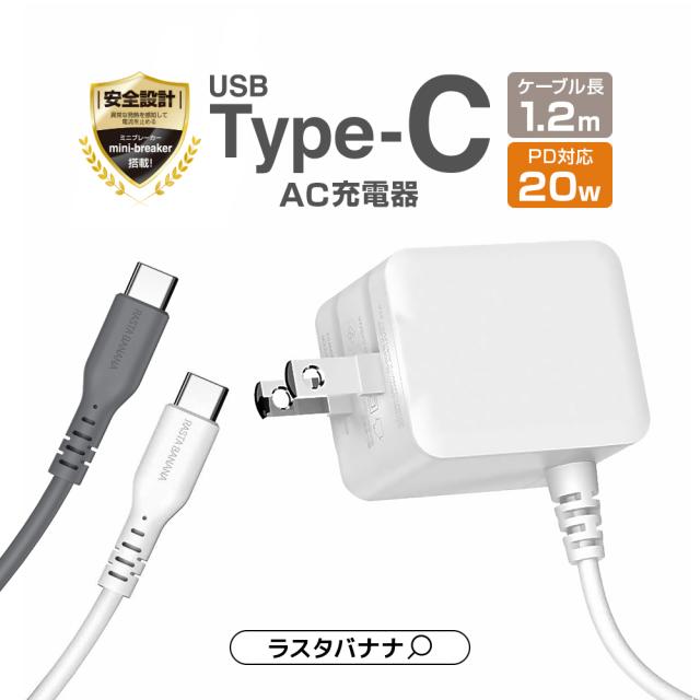 充電器 ACアダプター AC充電器 タイプC ケーブル直付 mini-breaker付 USB Type-C PD パワーデリバリー 高速充電 急速充電 安全設計 20W 1.2m iPhone iPad スマホ タブレット ラスタバナナ