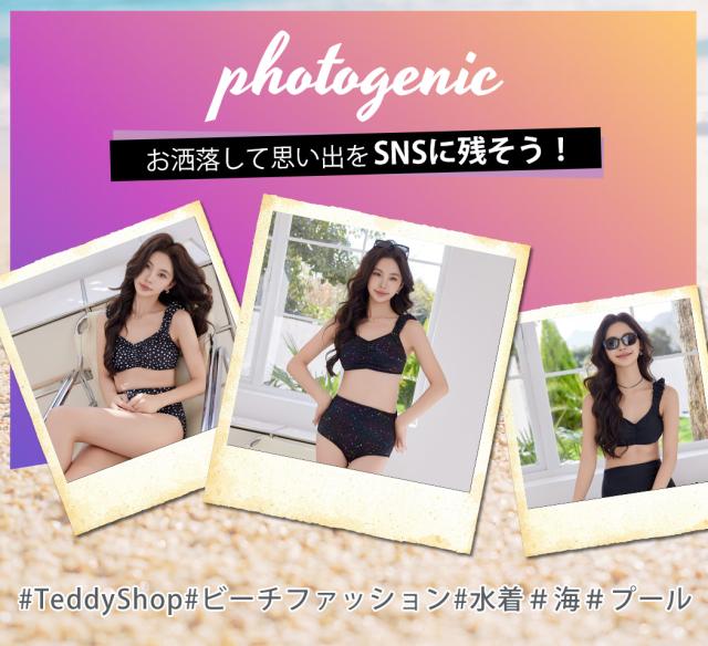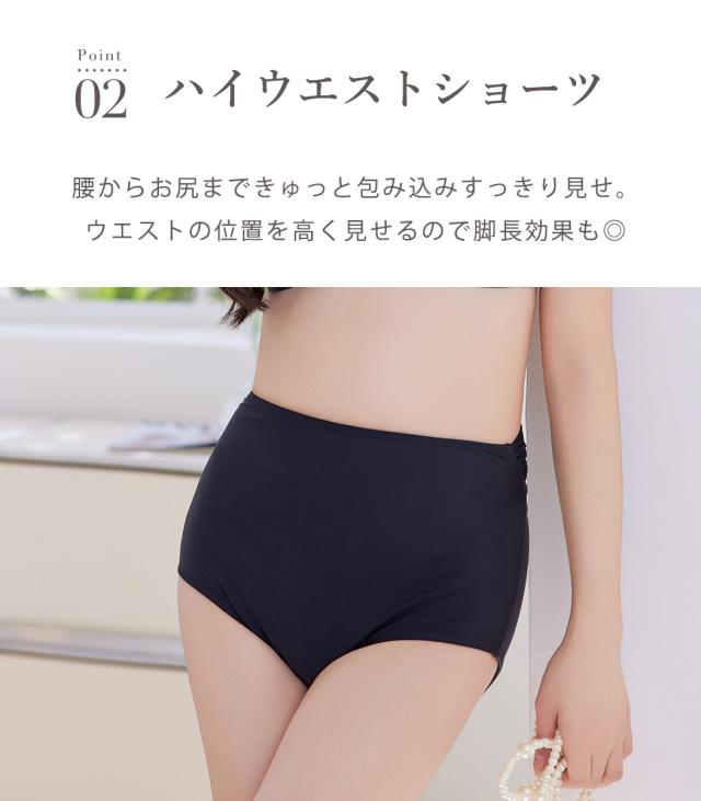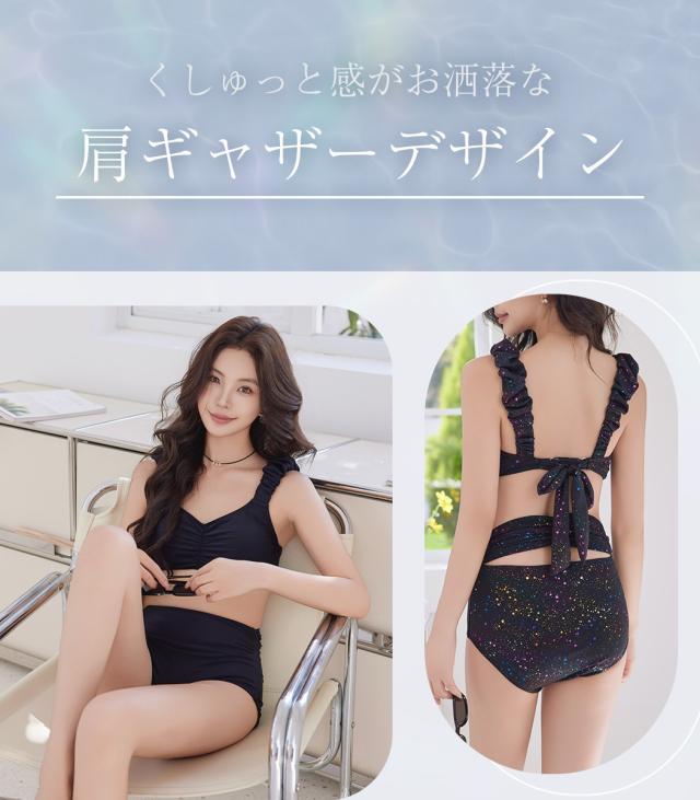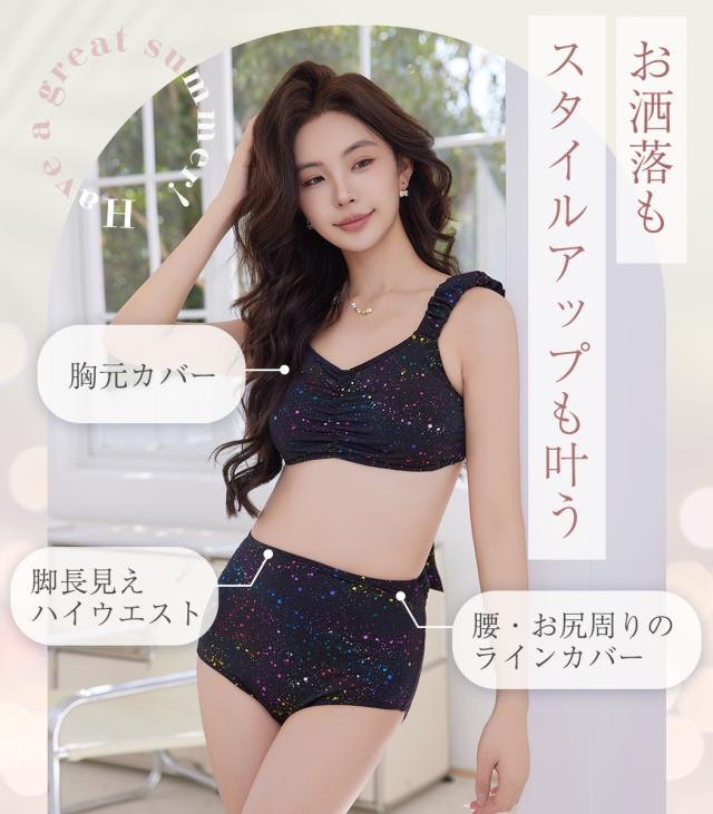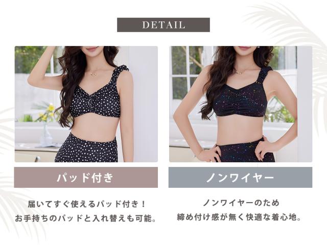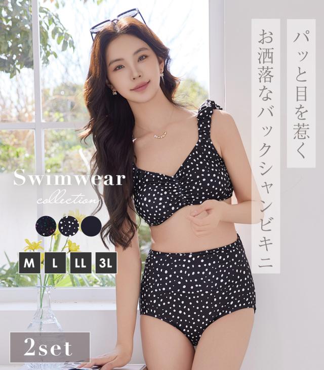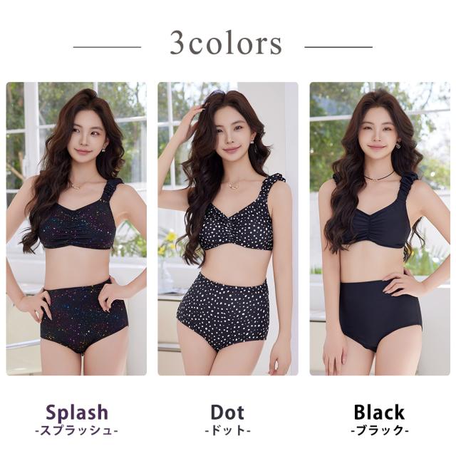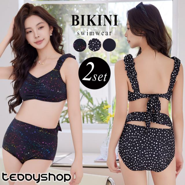 夏新作 ビキニ 水着 レディース 2点セット ショーツ セパレート ギャザー ゆるVネック カットアウト ノンワイヤー パッド付き バスト 盛れる ハイウエスト 脚長効果 アンダー調節 アジャスター 総柄 ドット 無地 白 黒