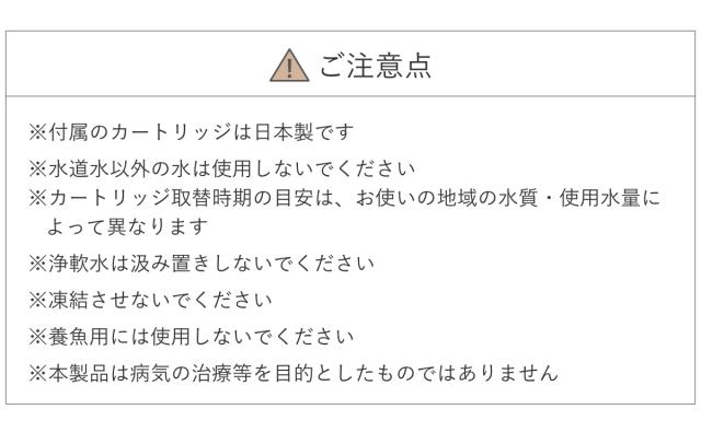 | 注意事項 | ※付属のカートリッジは日本製です ※水道水以外の水は使用しないでください。 ※カートリッジ取替時期の目安は、お使いの地域の水質・使用水量によって異なります。 ※浄軟水は汲み置きしないでください。 ※凍結させないでください。 ※養魚用には使用しないでください。 ※本製品は病気の治療等を目的としたものではありません。 |