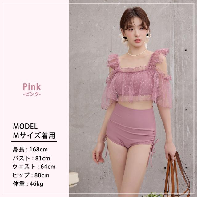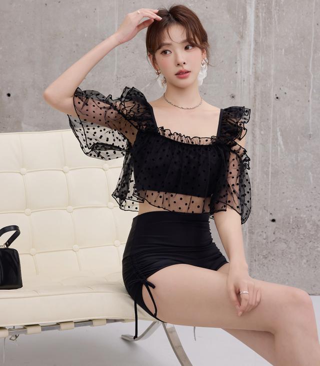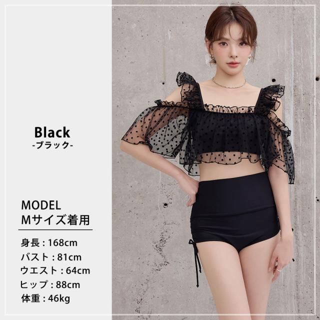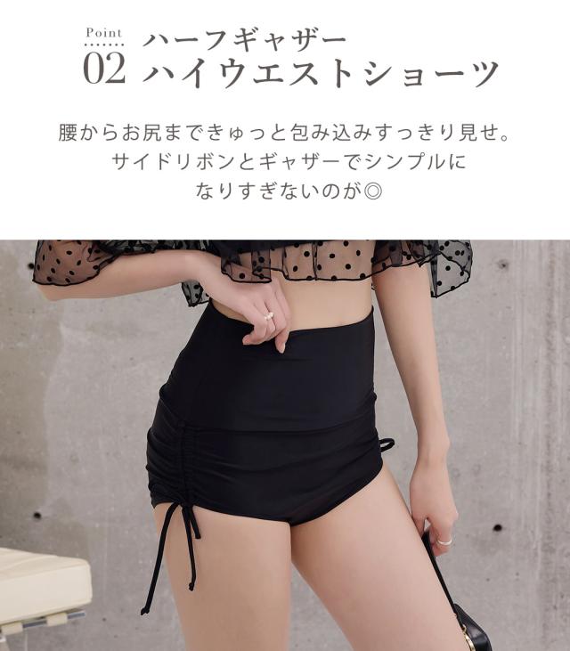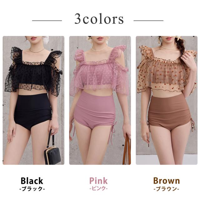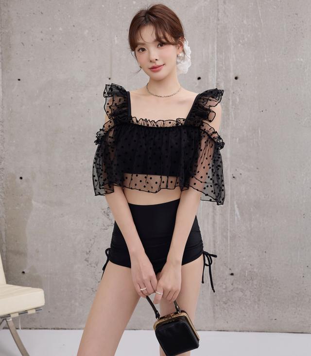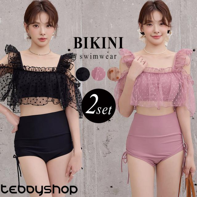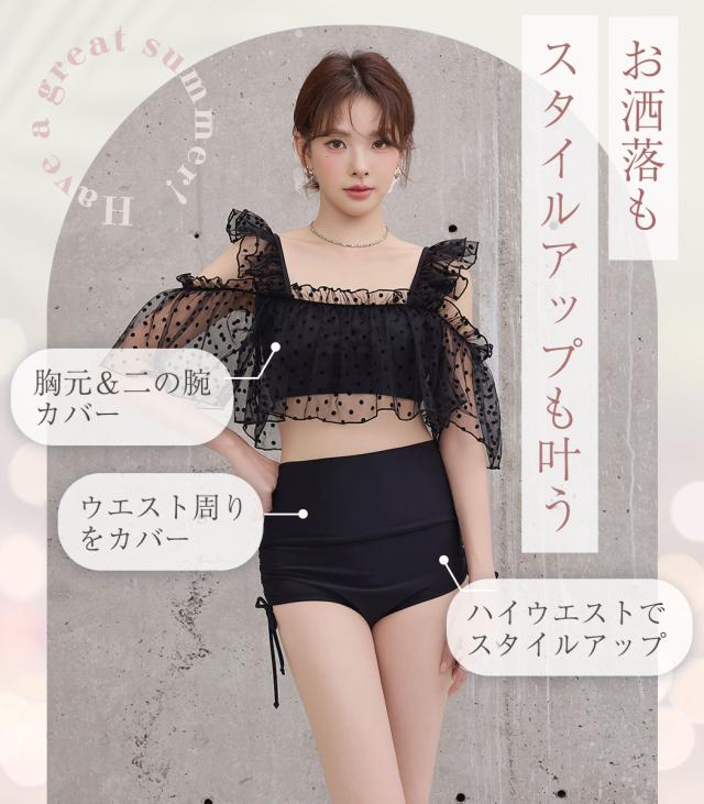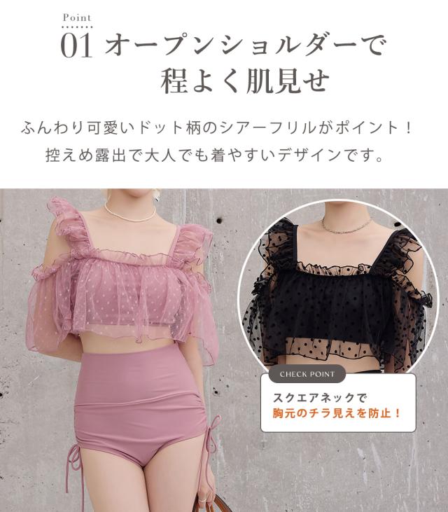 夏新作 ビキニ フリル 水着 レディース ハイウエスト ショーツ 2点セット セパレート シアー オープンショルダー スクエアネック 肩紐調節 サイドギャザー リボン ノンワイヤー パッド付き 盛れる 二の腕 ウエスト カバーアップ ドット柄 無地 黒