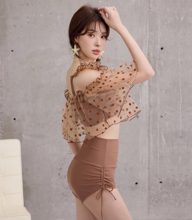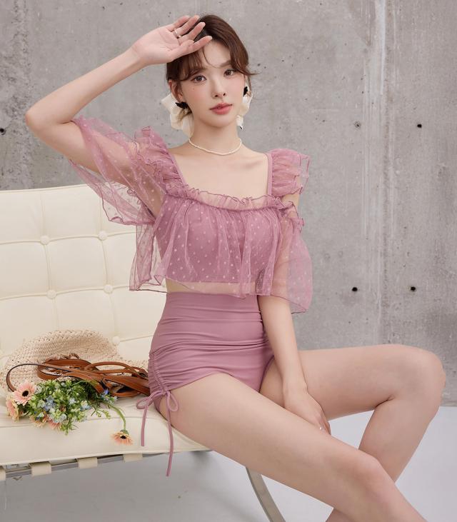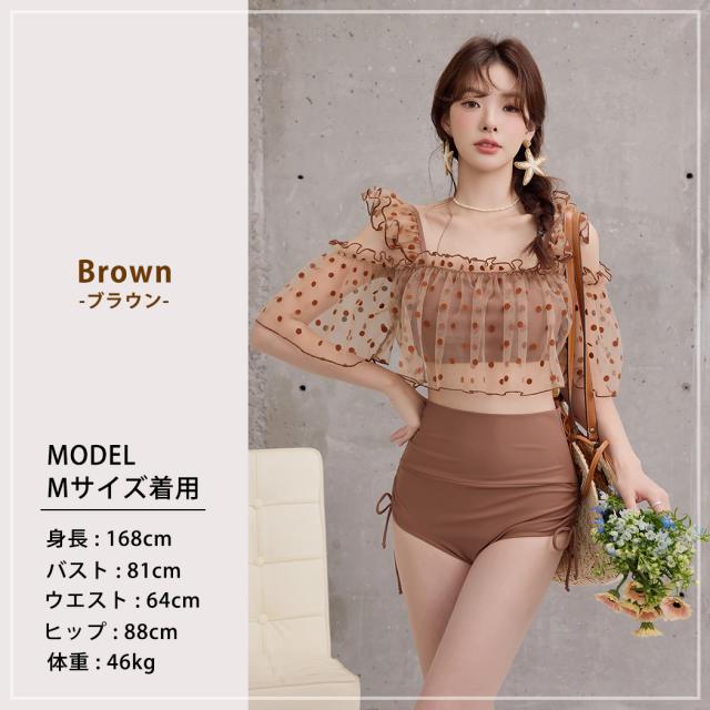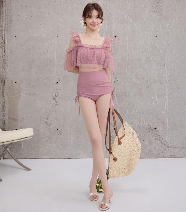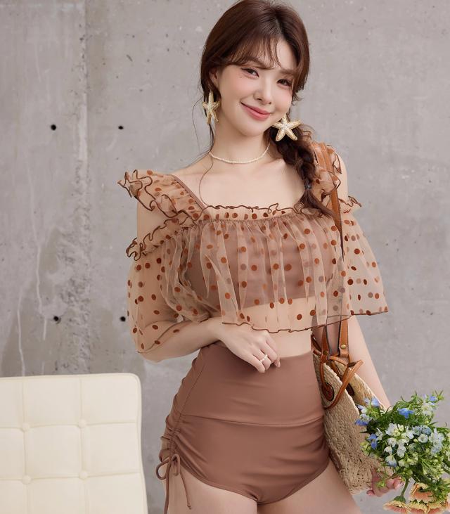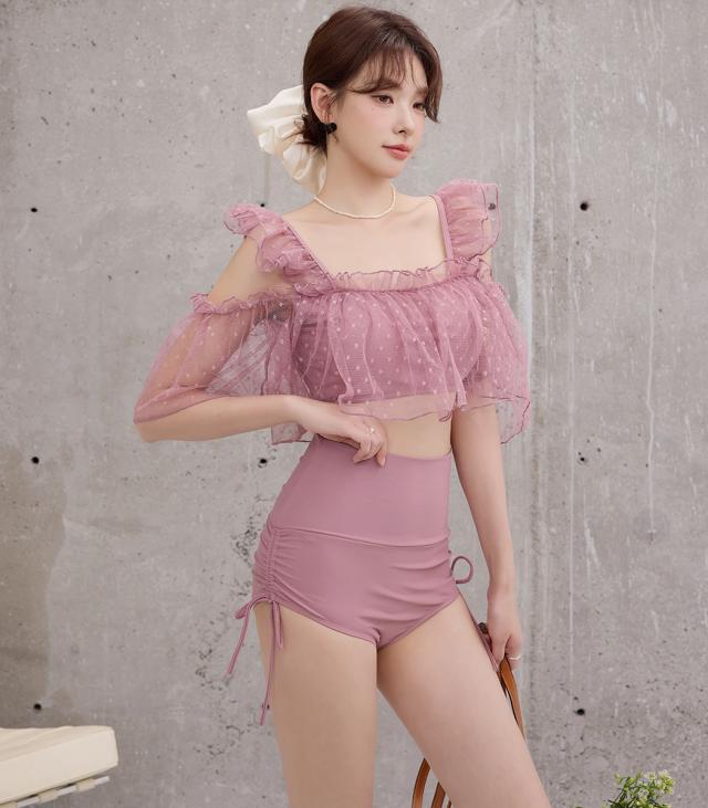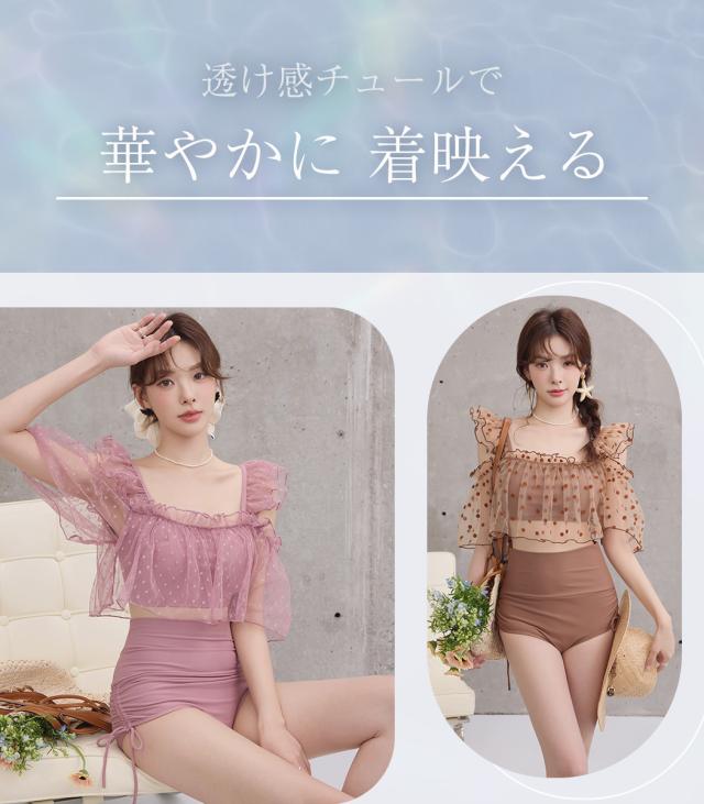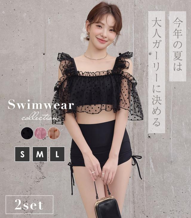 夏新作 ビキニ フリル 水着 レディース ハイウエスト ショーツ 2点セット セパレート シアー オープンショルダー スクエアネック 肩紐調節 サイドギャザー リボン ノンワイヤー パッド付き 盛れる 二の腕 ウエスト カバーアップ ドット柄 無地 黒