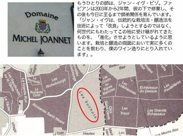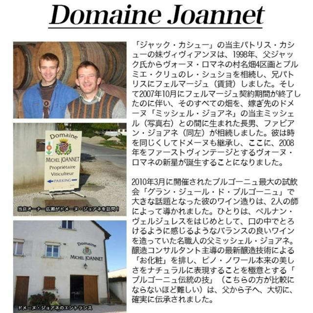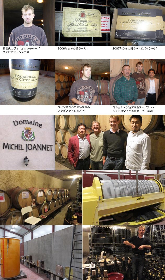 ヴォーヌ・ロマネの新星が誕生 「ジャック・カシュー」の当主パトリス・カシューの妹ヴィヴィアンヌは、1998年、父ジャック氏からヴォーヌ・ロマネの村名畑4区画とプルミエ・クリュのレ・シュショを相続し、兄パトリスにフェルマージュ(賃貸)しました。そして2007年10月にフェルマージュ契約期間が終了したのに伴い、そのすべての畑を、嫁ぎ先のドメーヌ「ミッシェル・ジョアネ」の当主ミッシェル(写真右)との間に生まれた長男、ファビアン・ジョアネ(同左)が相続しました。彼は時を同じくしてドメーヌも継承し、ここに、2008年をファーストヴィンテージとするヴォーヌ・ロマネの新星が誕生することになりました。