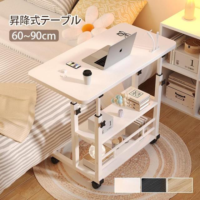 キャスター付き昇降式 ベッドサイドテーブル 60-90cm 高さ調節 3 段収納 60*40cm 丸角設計 ソファー脇テーブル/ワークデスク パソコン 化粧/学習仕事用 組立簡単