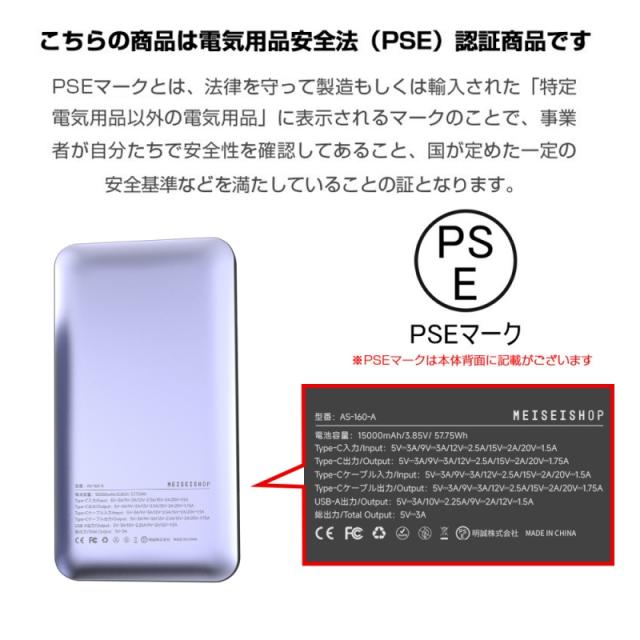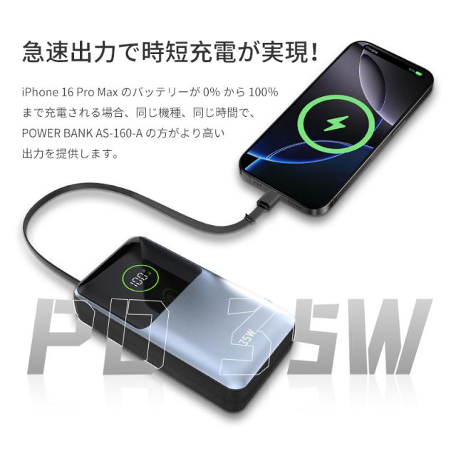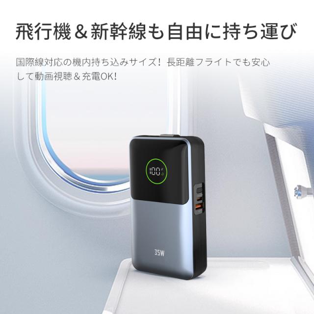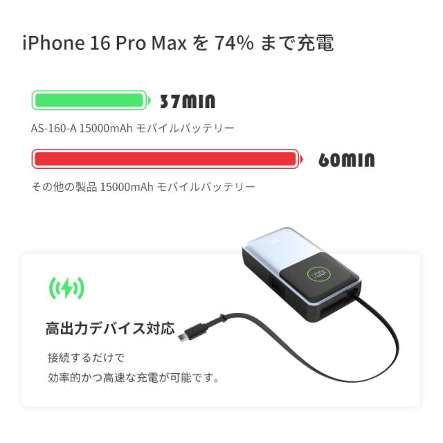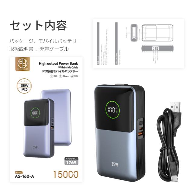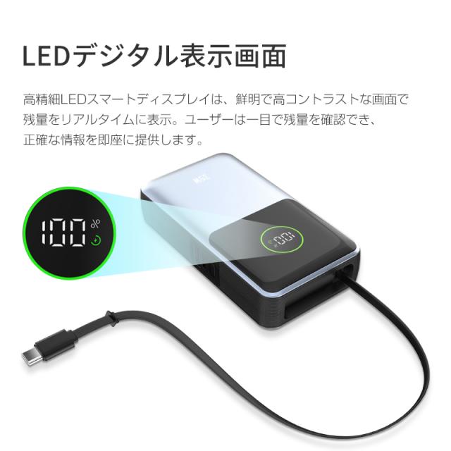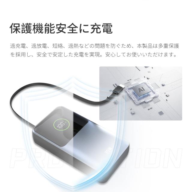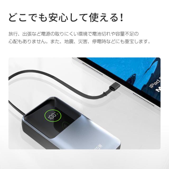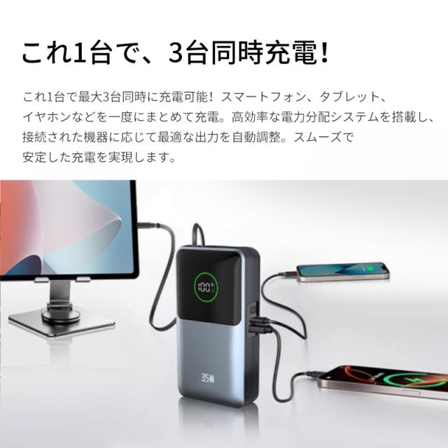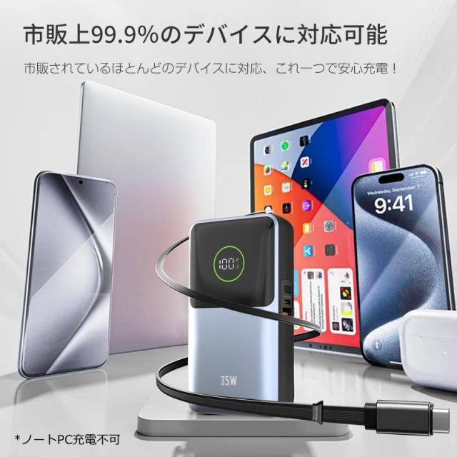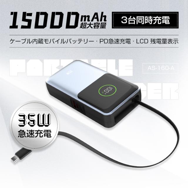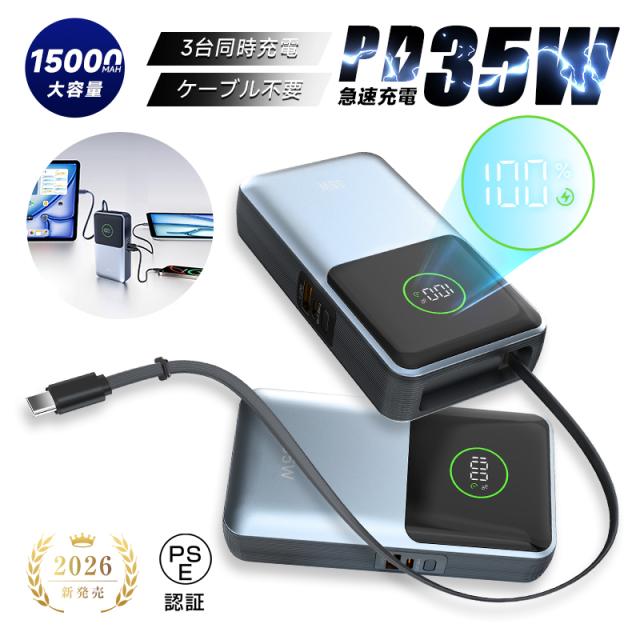 モバイルバッテリー 15000mAh 57.75Wh大容量 軽量 防災グッズ 3台同時充電 急速充電 PD対応 最大35W出力 LED残電量表示 2つのポート搭載 iPhone17/16充電 汎用性抜群 PSE認証 ポータブル ケーブル一体型 薄型 安全回路保護 機内持ち込み可 耐衝撃【PL保険加入済み製品・安心】