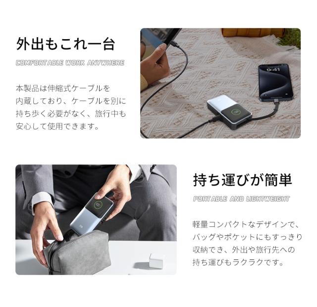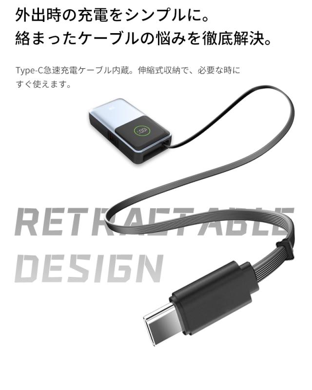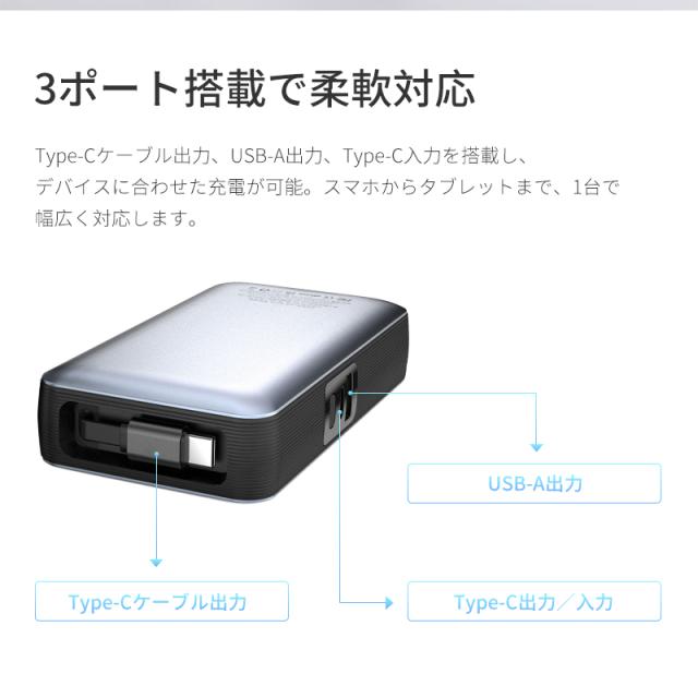 USB-AとType-Cポート各一つ、更に収縮可能なType-Cケーブル1本搭載で、最大3台の機器を同時に充電でき、複数人での使用にもぴったり。