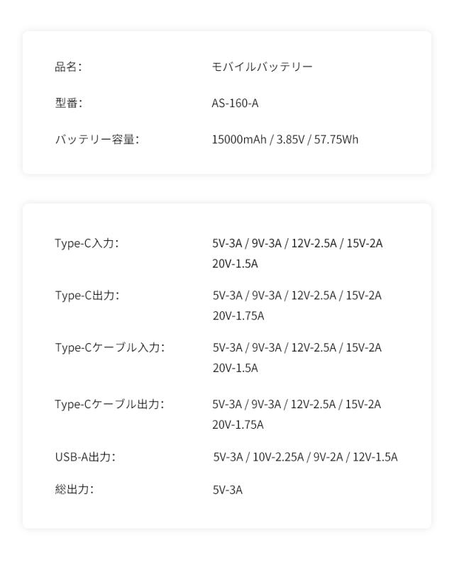 Type-C入力:5V-3A/9V-3A/12V-2.5A/15V-2A/20V-1.5A