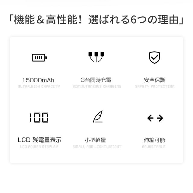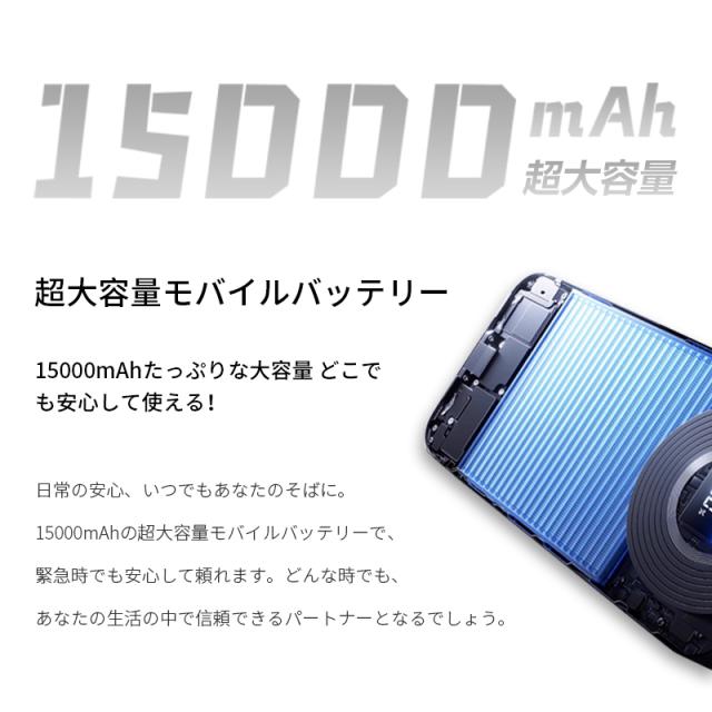 忙しい日常をサポートするためにデザインされたモバイルバッテリーです。コンパクトでありながら、15000mAhの大容量電池を搭載し、スマホであれば約2/3回フル充電可能です。