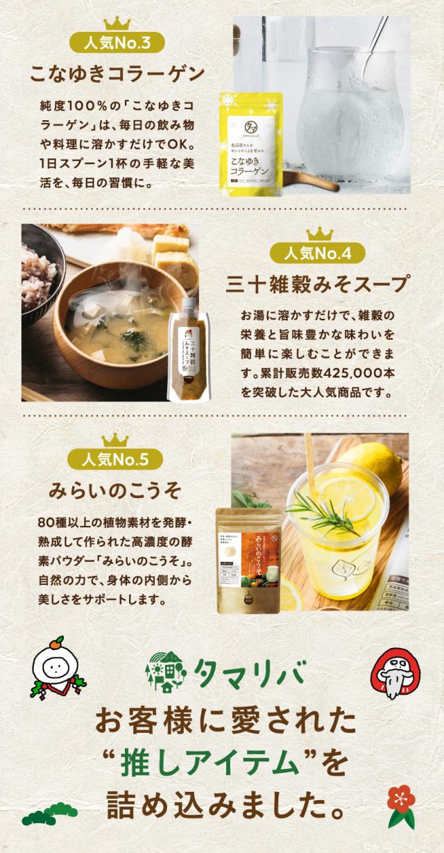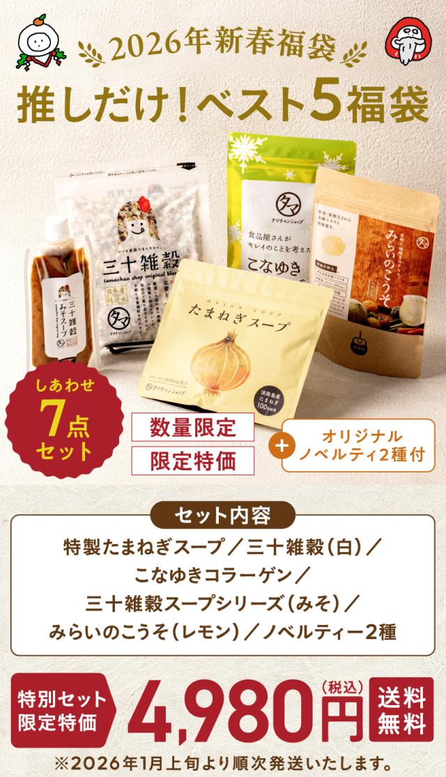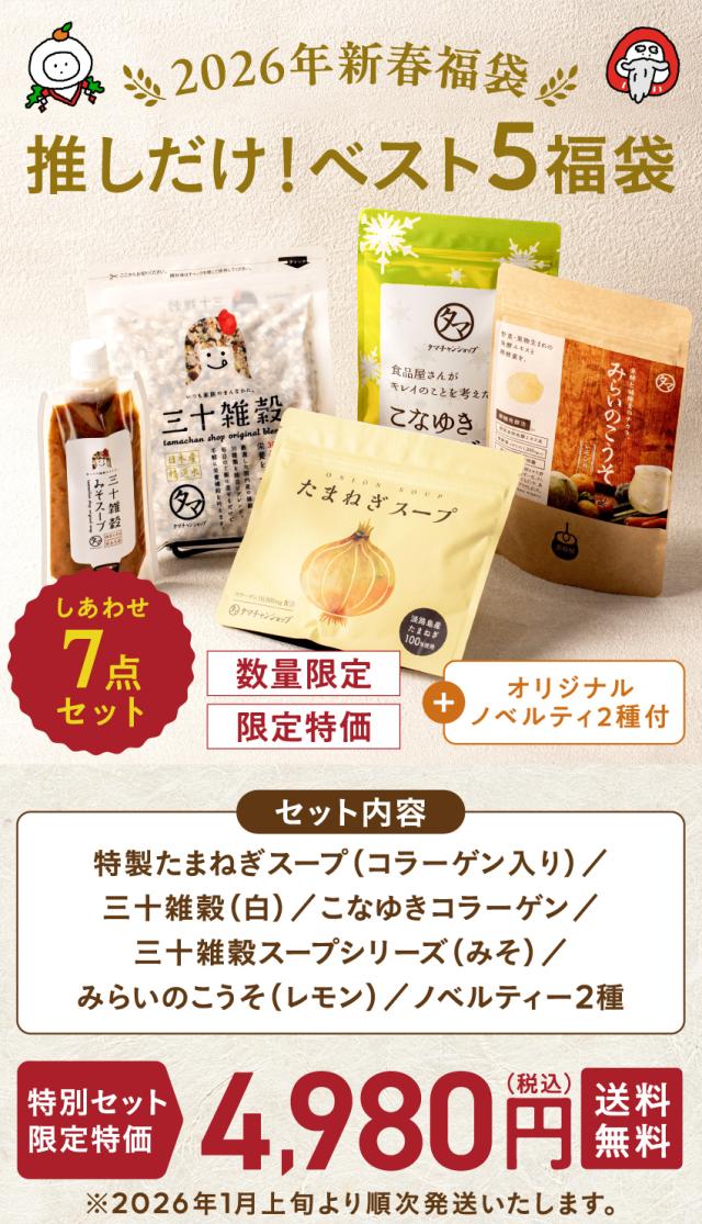 \新春2026/【限定350セット】「推しだけ!ベスト5福袋」 送料無料 タマリバ3周年記念 人気アイテム Best5 福袋 タマチャンショップ ノベルティ付き 7点セット 数量限定 限定特価 こなゆきコラーゲン 三十雑穀 味噌 みらいのこうそ レモン 冬 セット まとめ買い