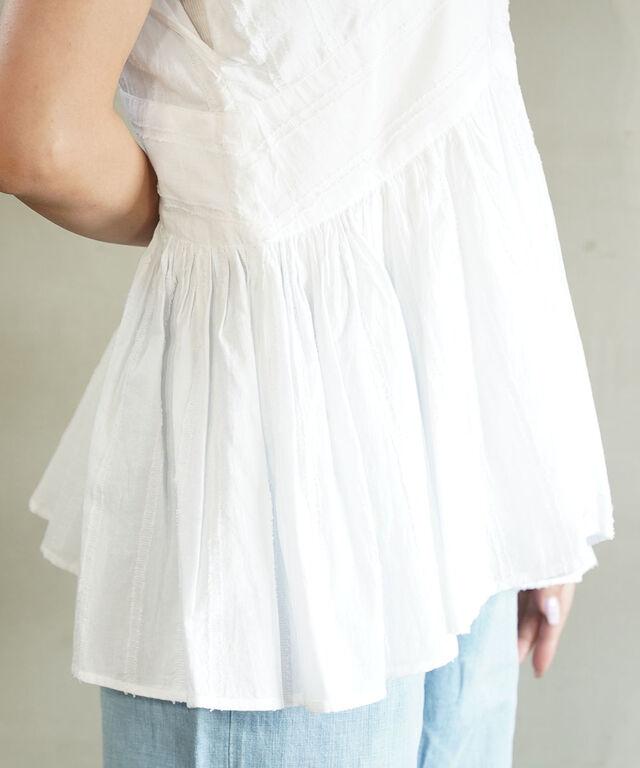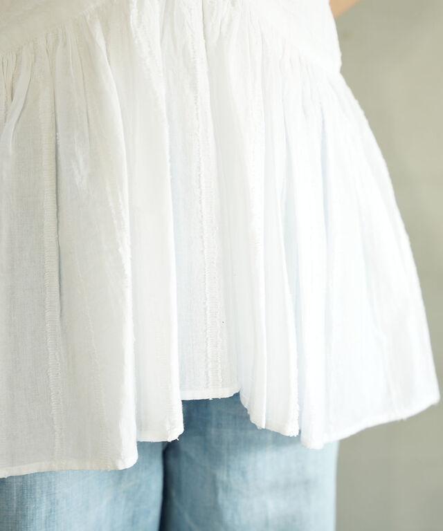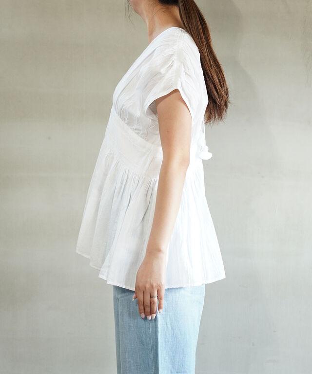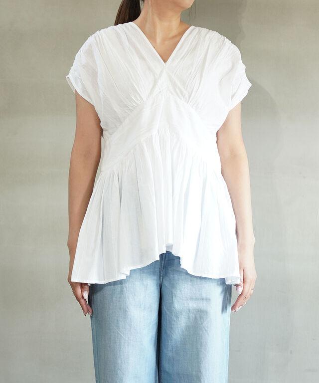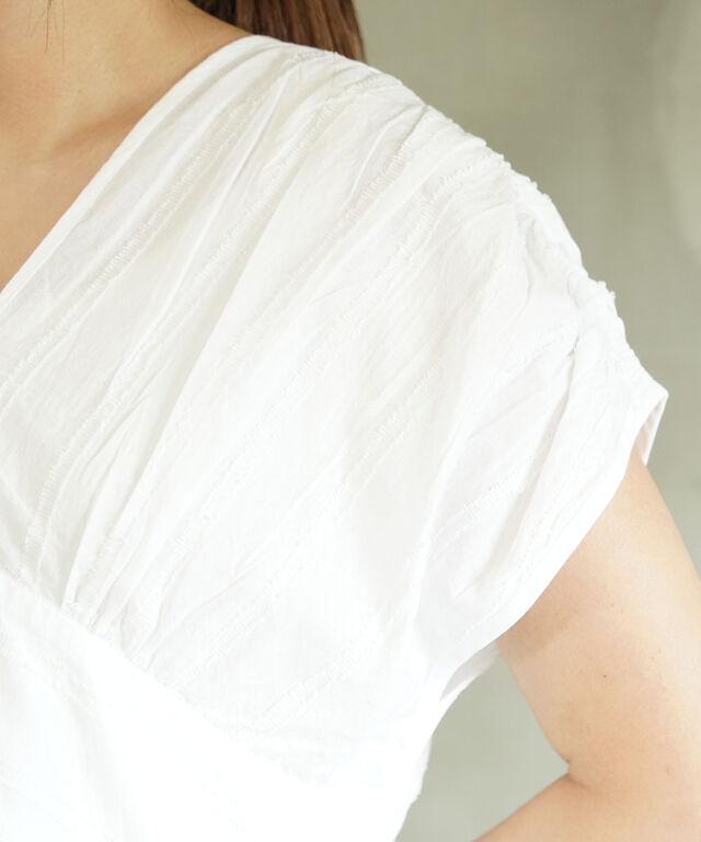 肩から寄せたギャザーがランダムなプリーツ風に仕上げて、立体感を醸し出しています。