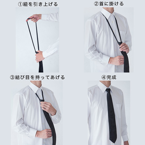 首にかけて引き上げるだけで簡単に装着できる、便利な【ワンタッチネクタイ】です。