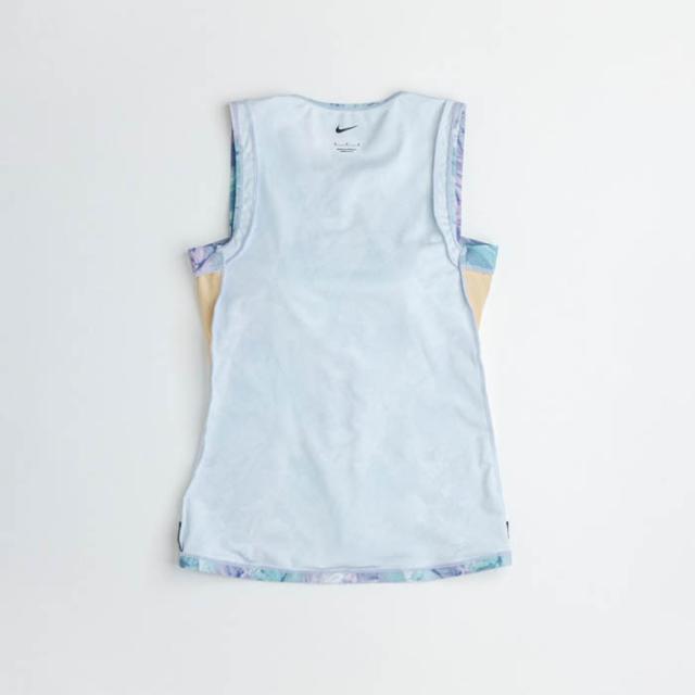 柔らかな色合いの華やかなプリントが顔まわりを明るく見せてくれるNikeの総柄水着。脇周りをスッキリ見せる、「ハミ肉防止」の仕様。