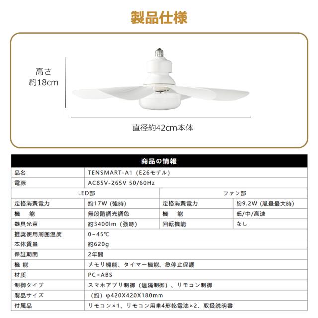 パッケージ内容:LEDシーリングファンライトx1、専用リモコンx1、リモコン用単4形乾電池x2、取扱説明書