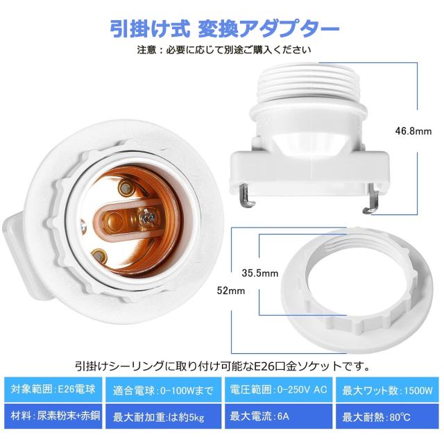- 工事業者を呼ぶことなく、ご自身で手軽に取り付け可能です。ライト全体をE26ソケットにスイベルマウントするだけで、女性一人でも簡単に設置できます。また、レビューにご参加いただくと、引掛け式変換アダプターをプレゼントいたします!